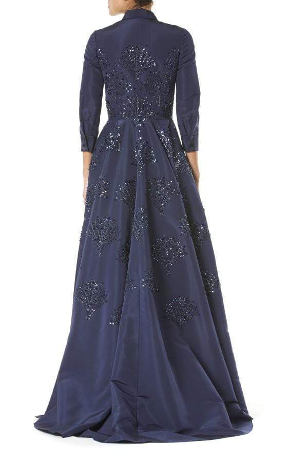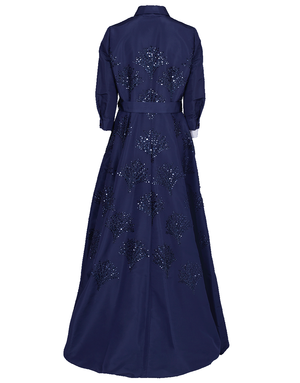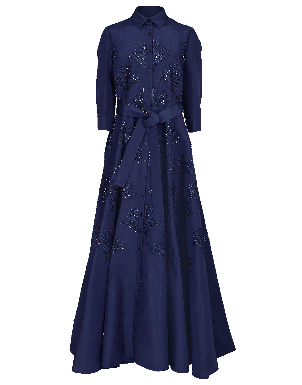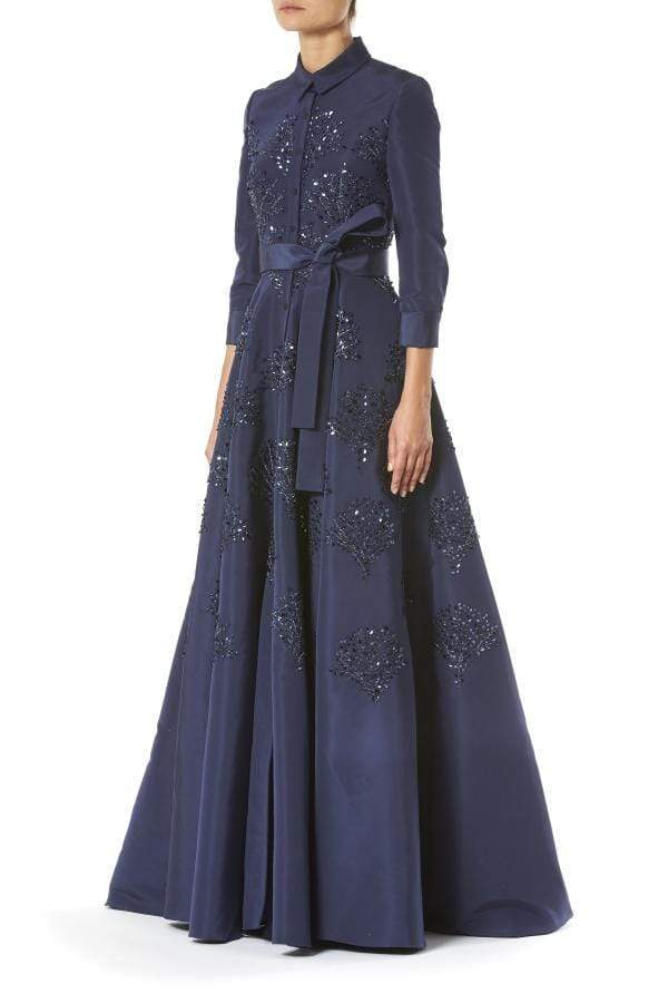 Sapphire embroidered gown from Carolina Herrera featuring a spread collar, button front, 3/4 length sleeves, full skirt with slight train, side pockets, and a belted waist.