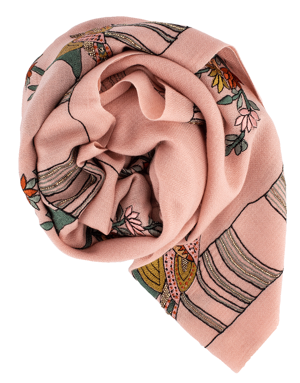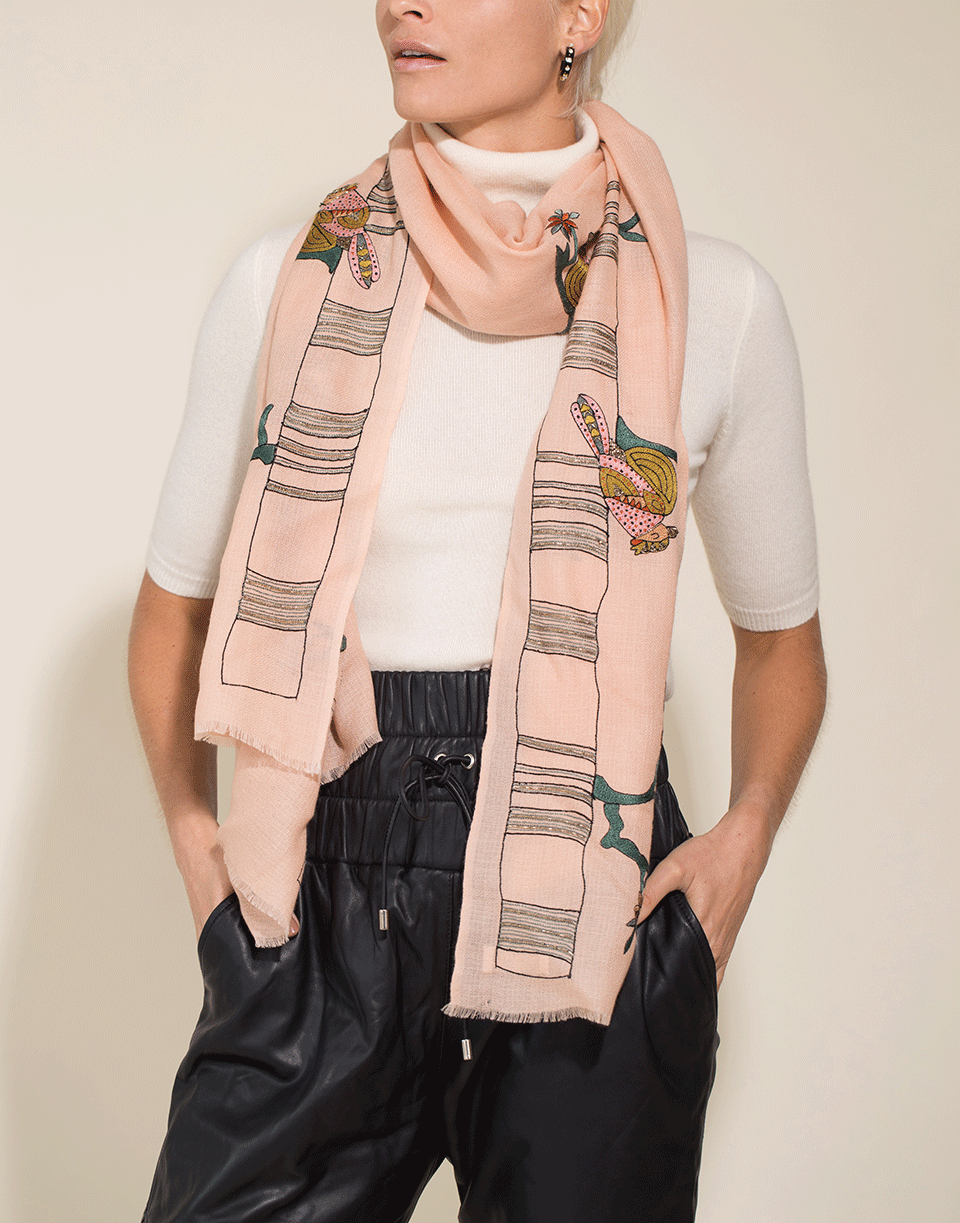 K. Janavi’s embroidered bird scarf features an embroidered illustration on cashmere. It is handcrafted in India by local artisans who specialize in the use of embroidery and embellishment.