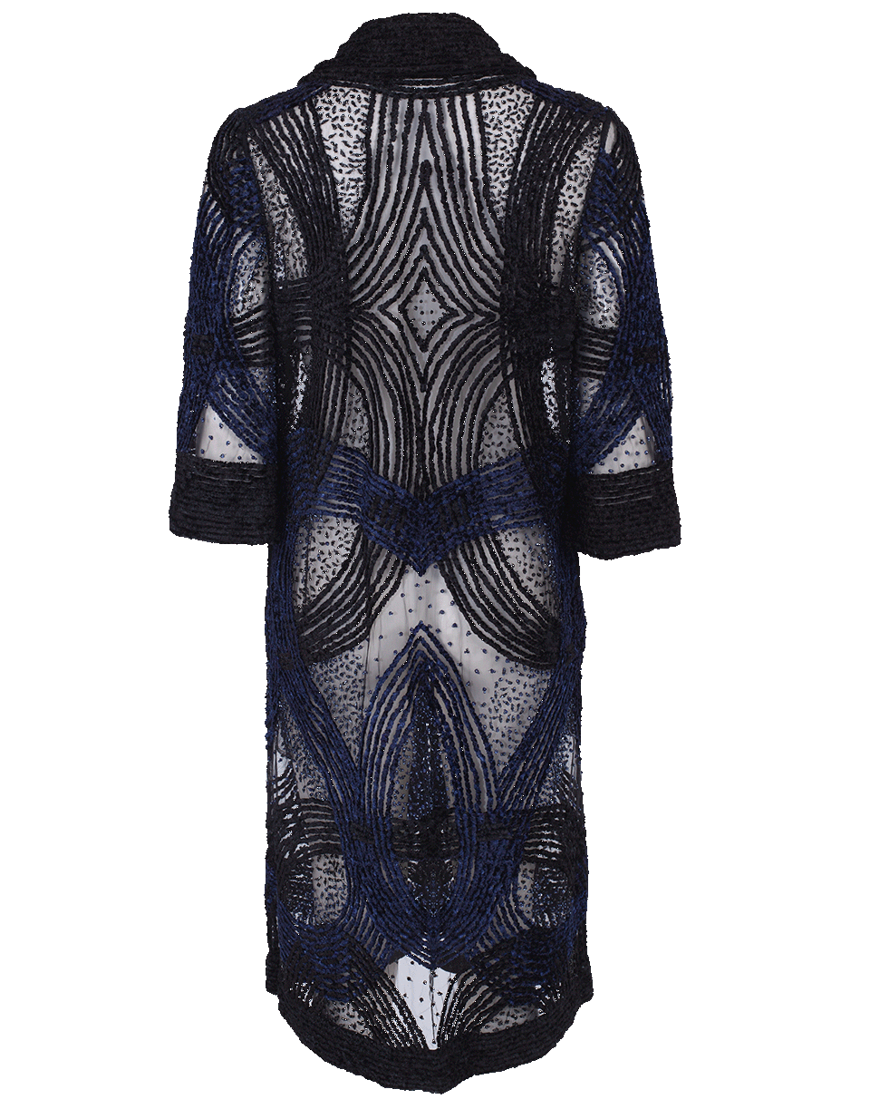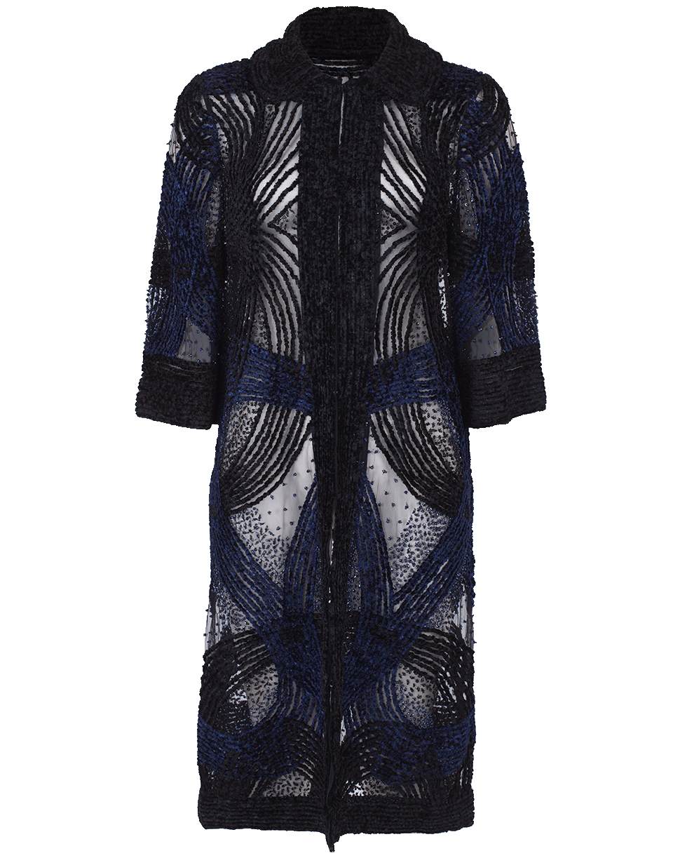 This embroidered sheer coat from Naeem Khan features a loose fit, knee length, peter pan collar, hook/eye closures, and beaded details throughout.