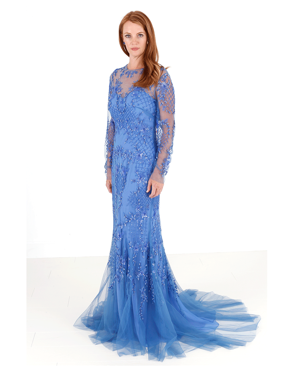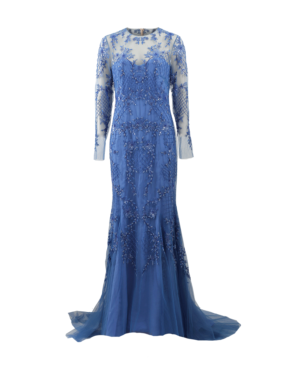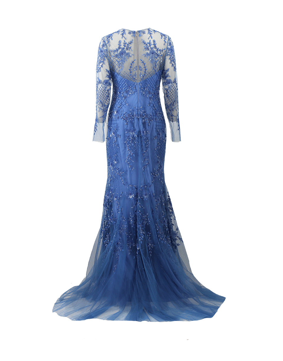 Crew Neckline With Back Zip Closure, Sheer Illusion Upper-Bodice With All-Over Embroidery