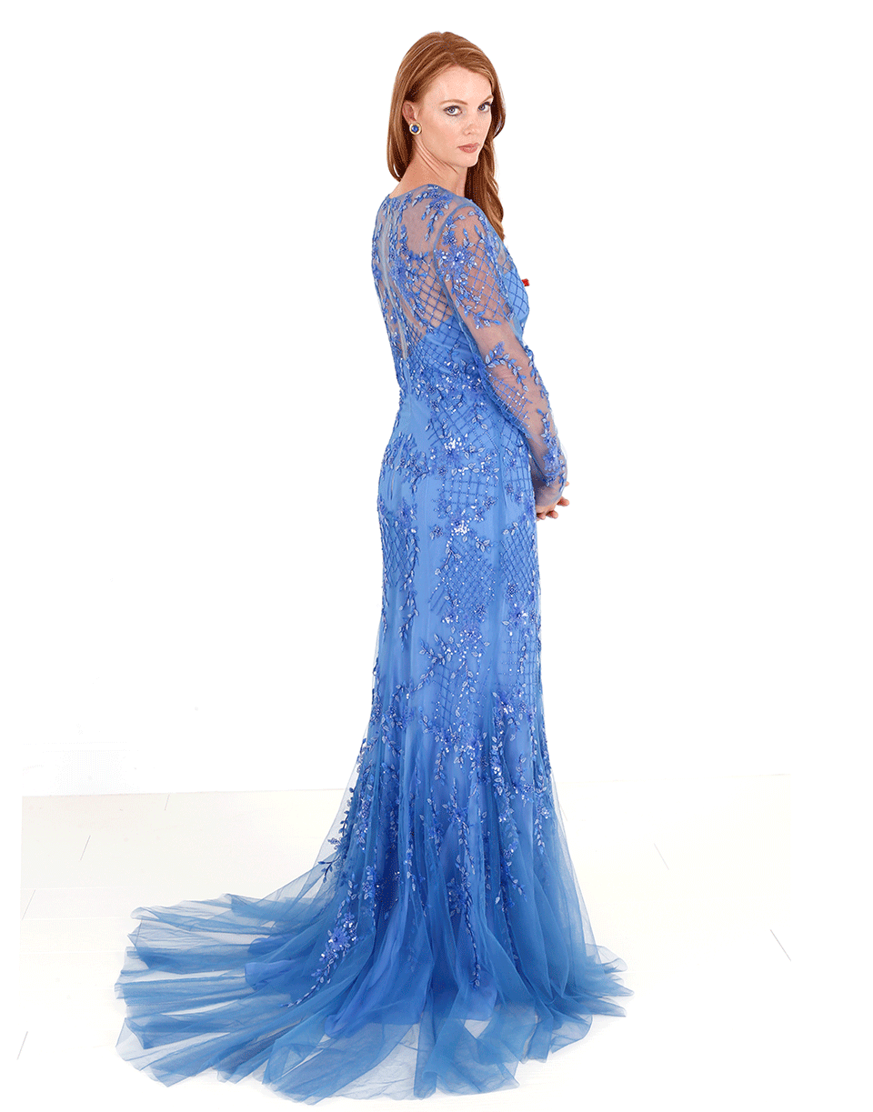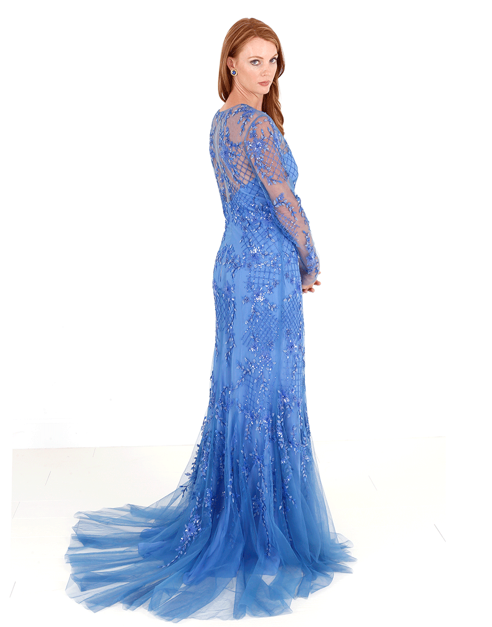 Sweetheart Neckline With Low Back, Sheer Long Sleeves, Slim-Fitting Silhouette And Flared Hemline With Train