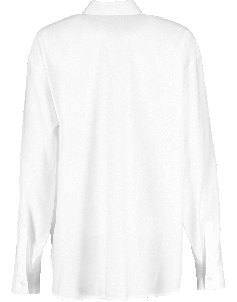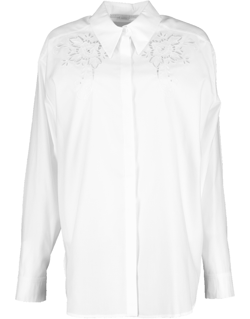 This white Stella McCartney loose fitting button down top features a spread collar with a front button closure, long sleeves, embroidered shoulder detail and tunic length cut.