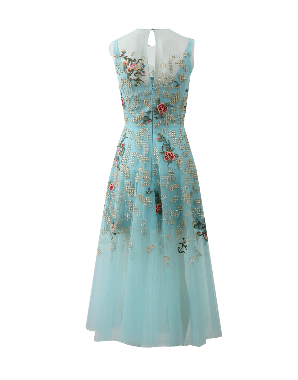Illusion Neckline Wtih Floral And Glass Bead Detailing And Raw Hemline