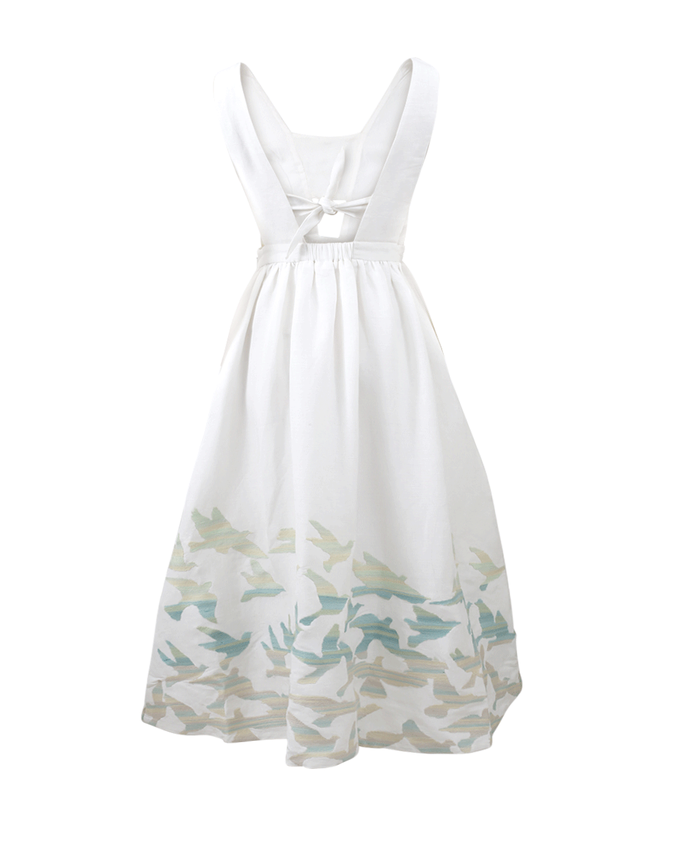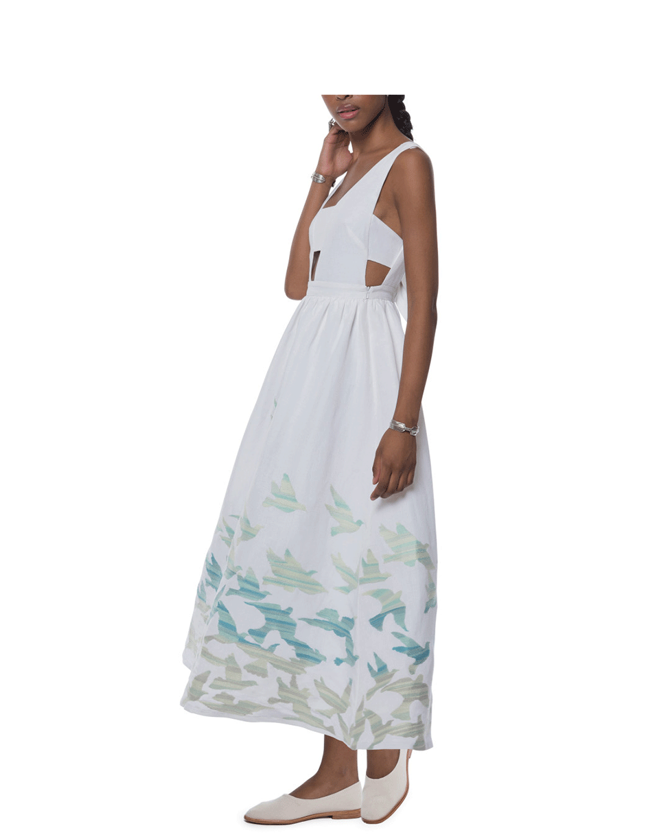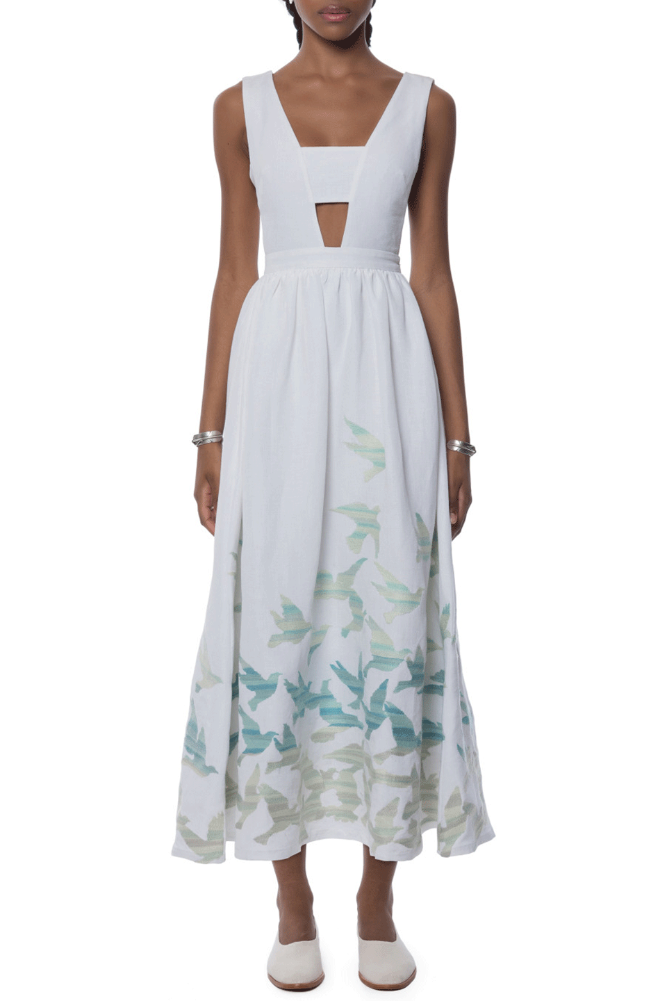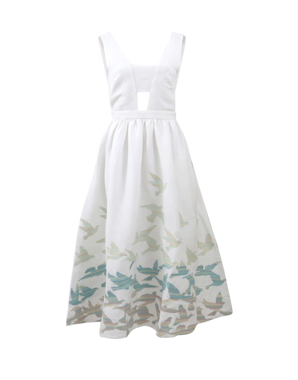 Embroidered Bird Design At Hem, Side Pockets And Side Cut-Outs, A-Line Silhouette And Midi-Length Cut