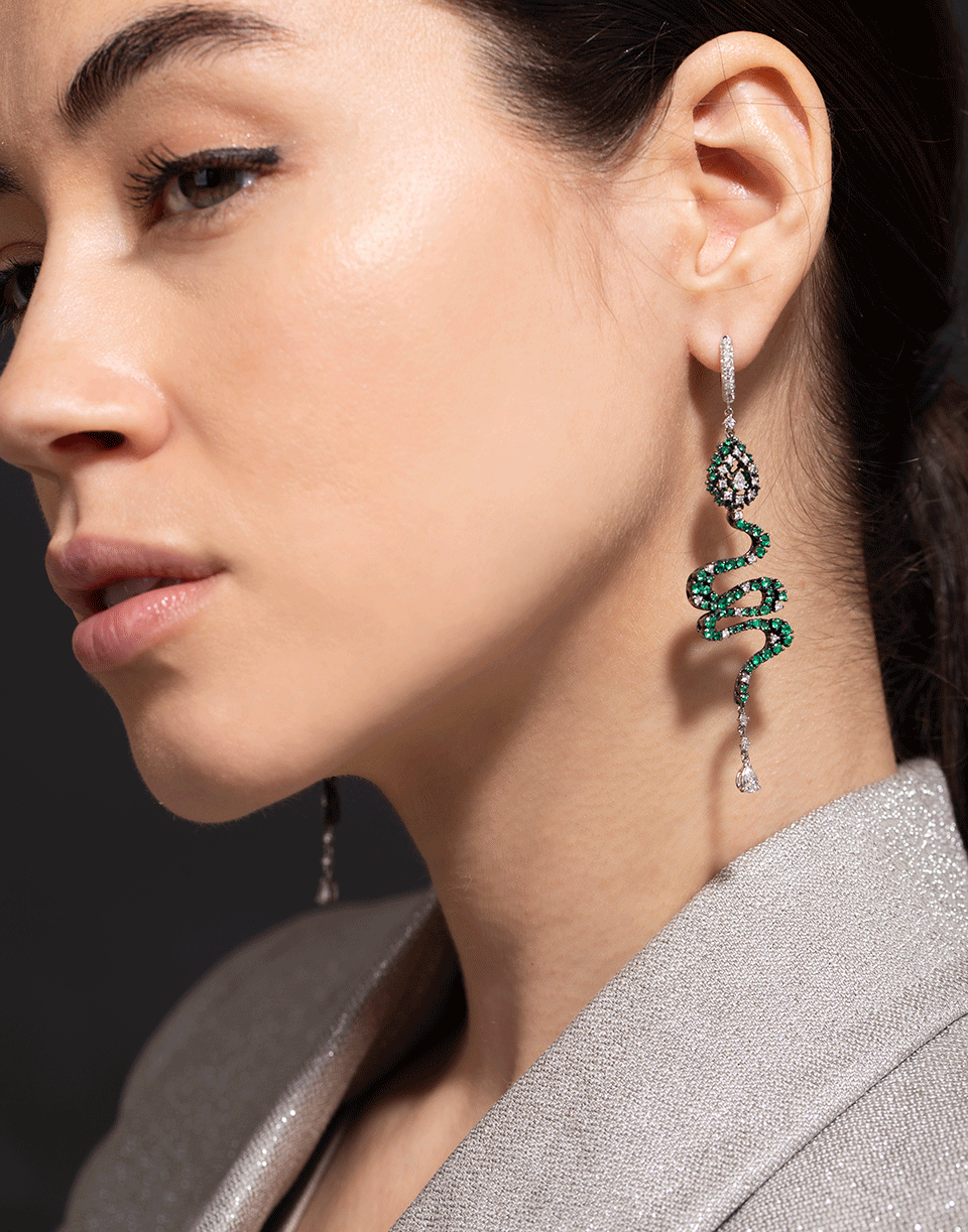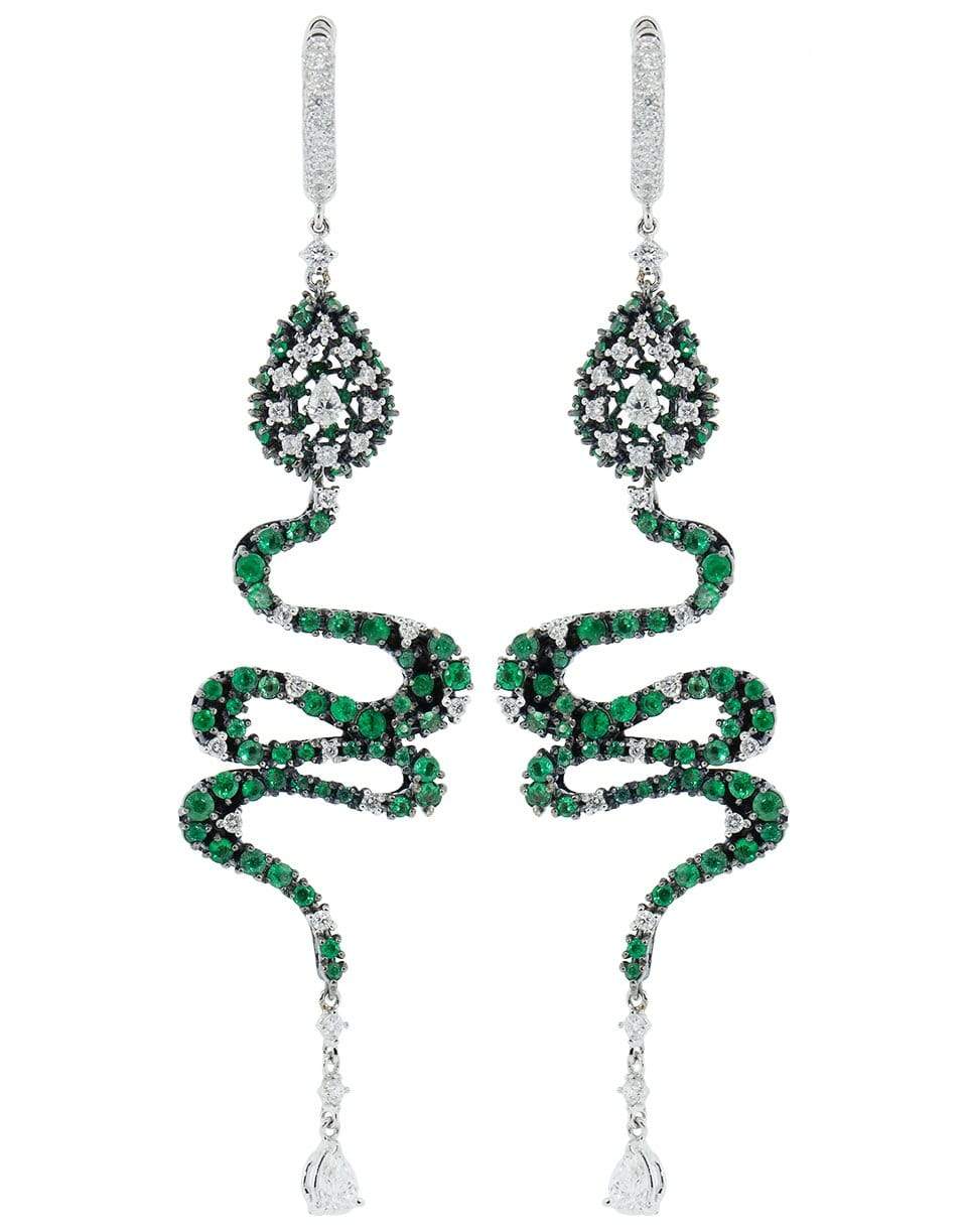 Emerald and diamond snake drop earrings from the Mariani Snake Collection. For pierced ears.