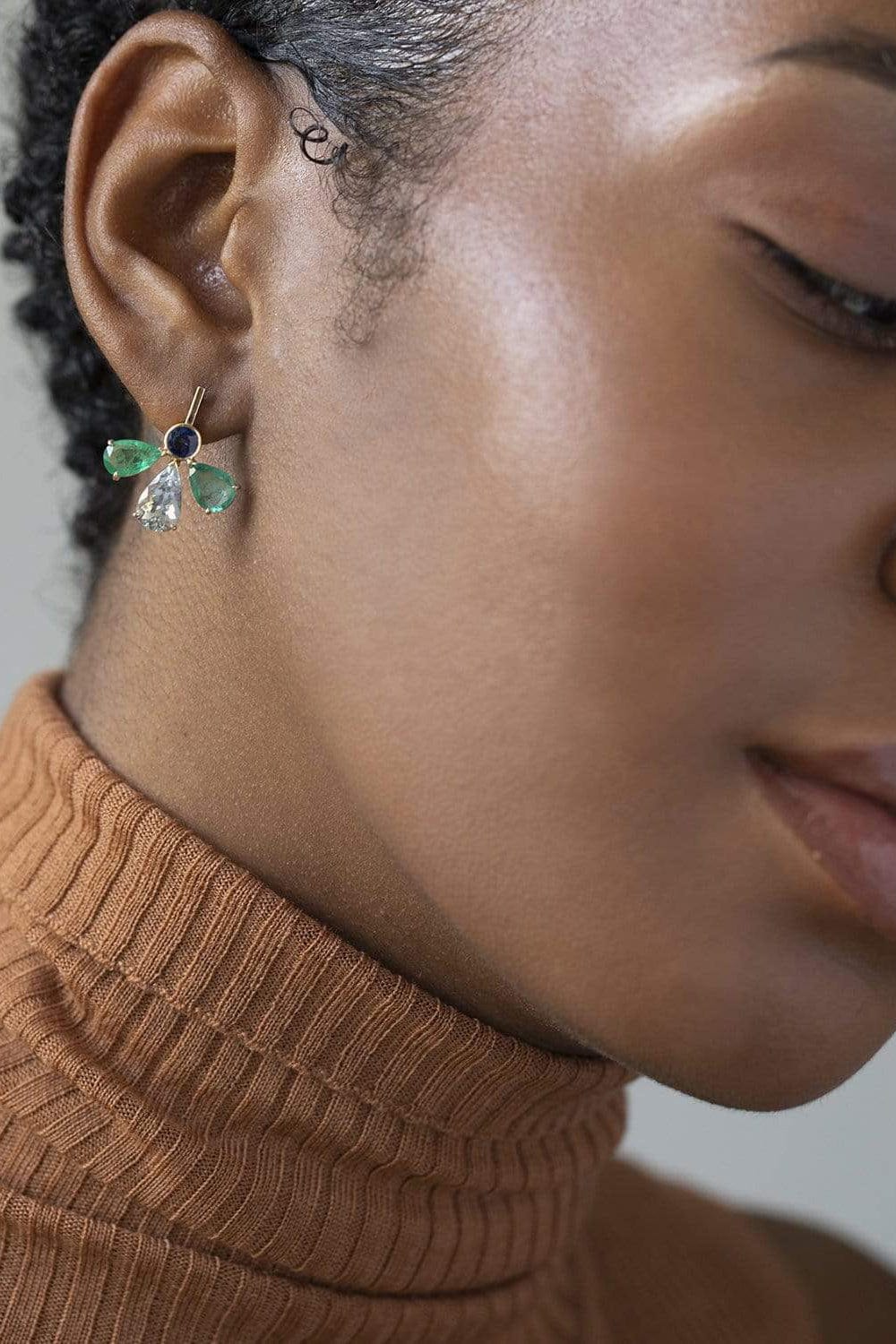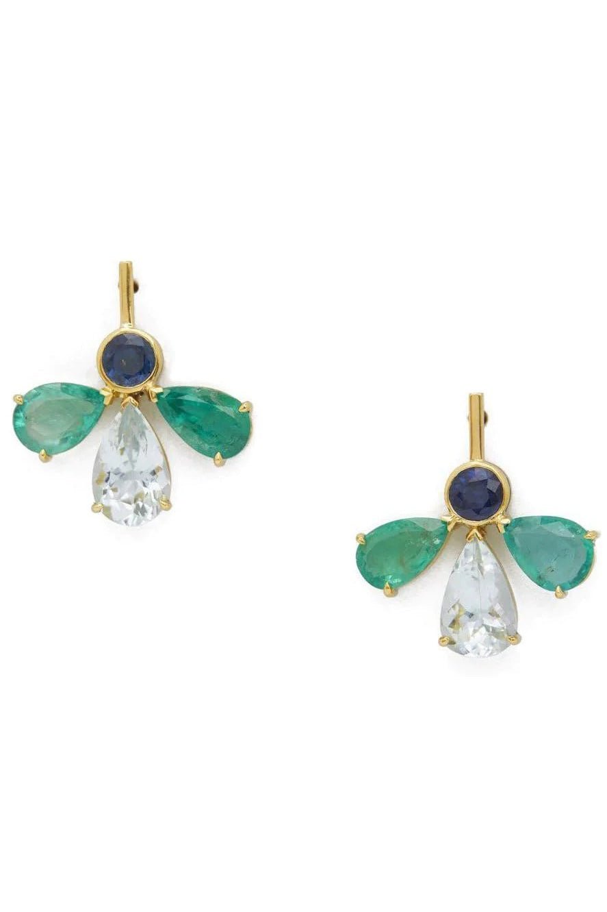 Yi Collection Emerald, aquamarine and blue sapphire faunu earrings. These are our campaign earrings made entirely by hand. Spectacular aquamarines and emeralds combine to form the body and wings of our fauna earrings. Two brilliant cut Sri Lankan sapphires make ground this pair of gorgeous earrings.