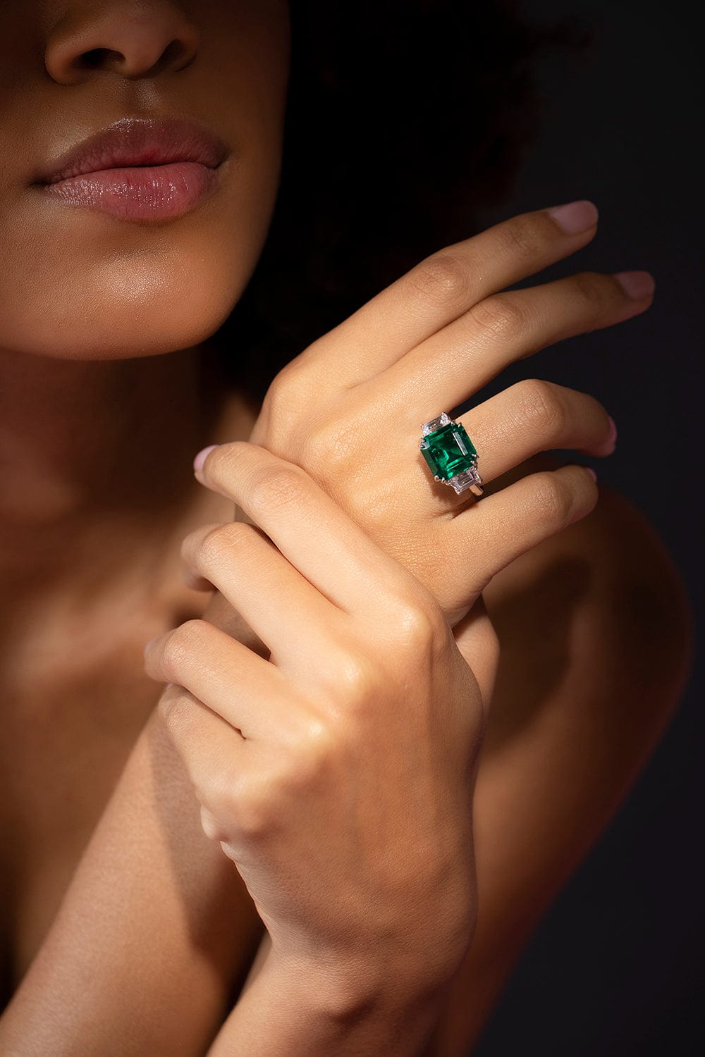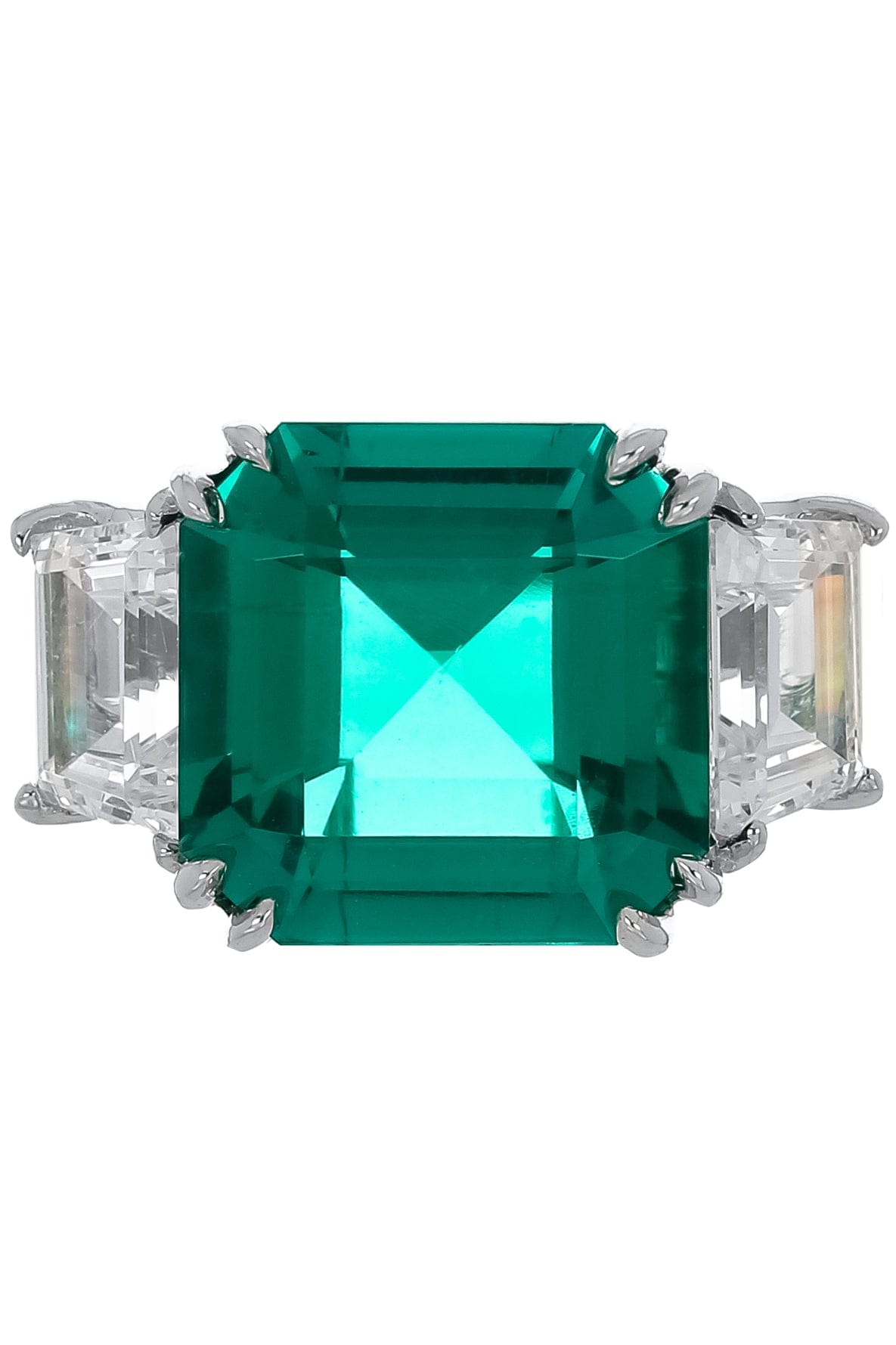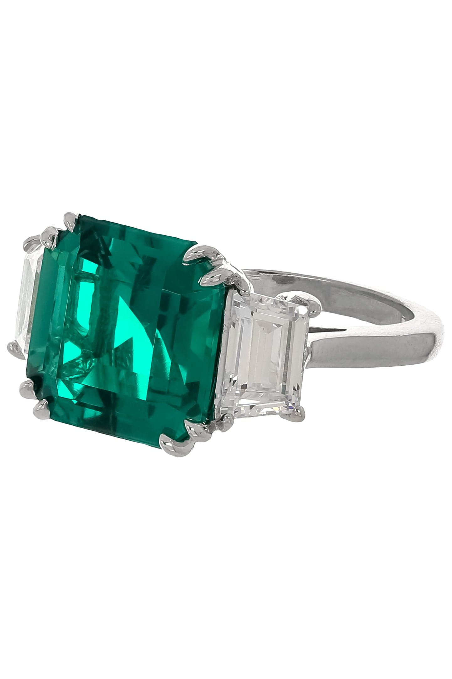 Fantasia by Deserio asscher cut emerald cubic zironia three stone ring.