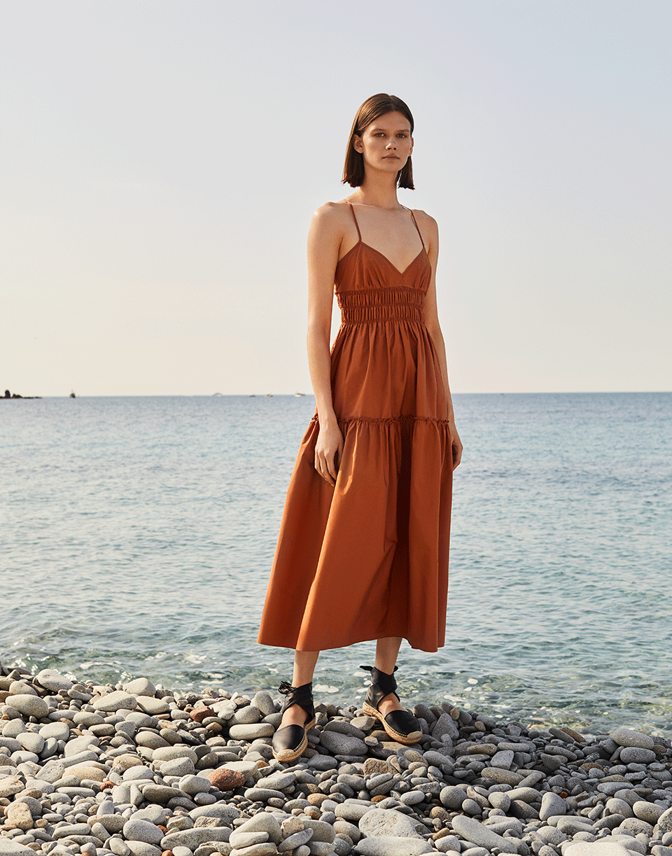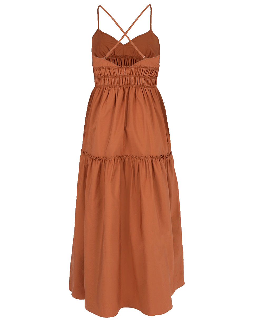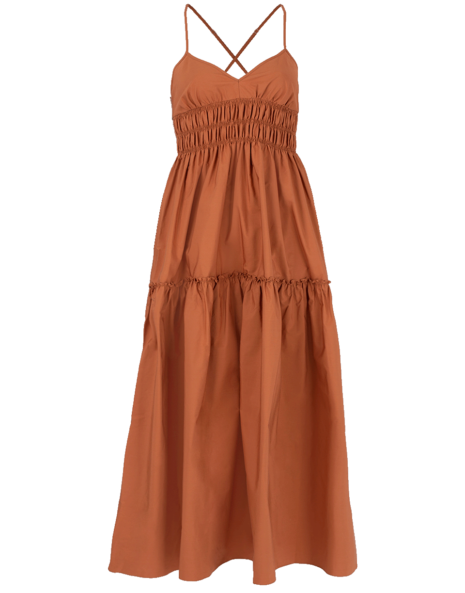 Copper midi dress by Three Graces London. This midi length dress features skinny-cross over back straps, v-neckline, a shirred waistband and a tiered, ruffled hem panel.