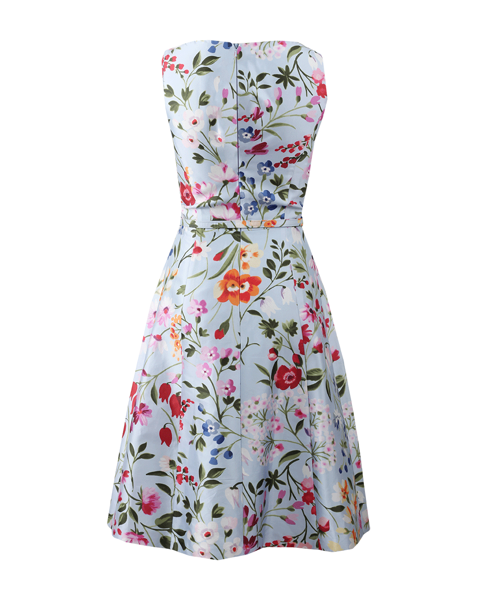 Bateau Neckline With All-Over Floral Print, Back Zip Closure, And Slight Shimmer Fabric
