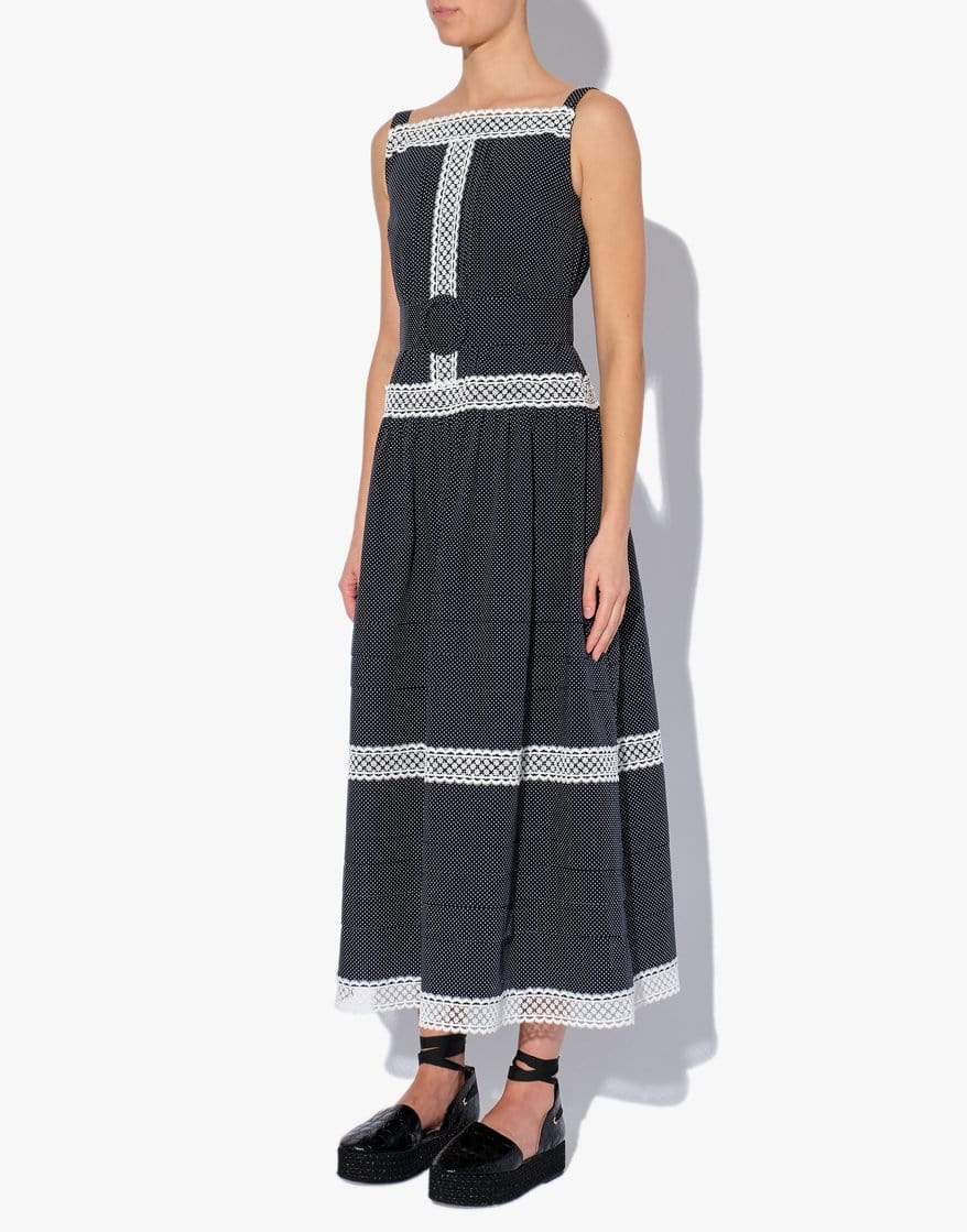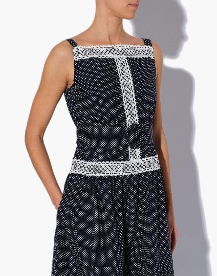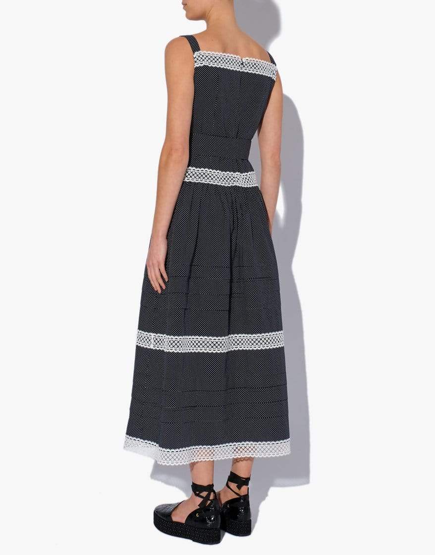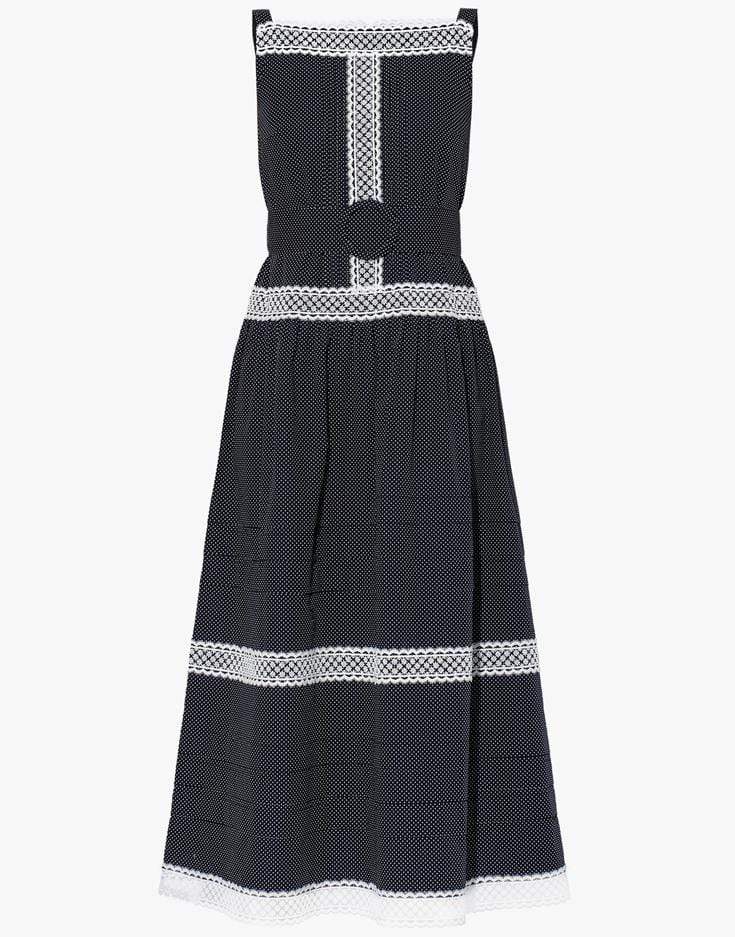This Erdem 'Eris' sleeveless dress falls to calf length. This style is fitted to the waist with a full skirt and has lace details.