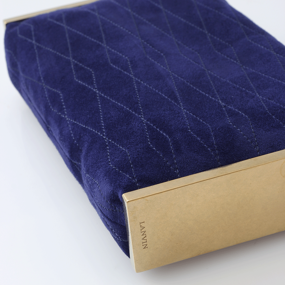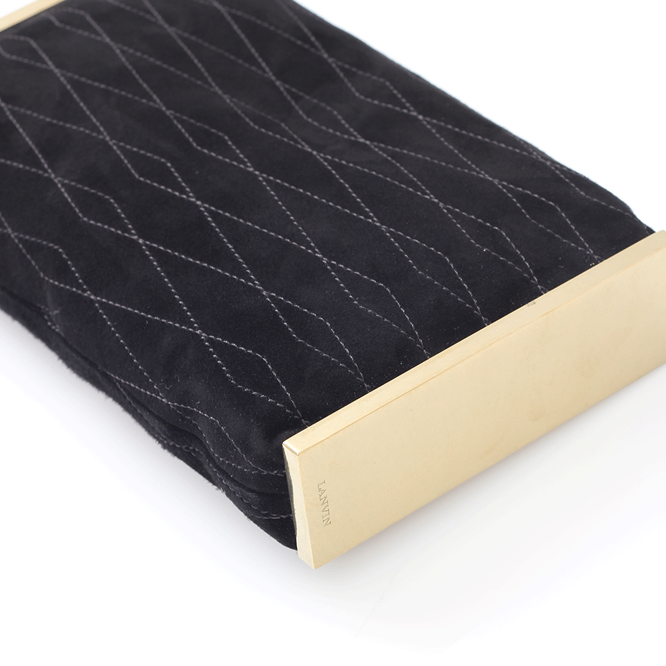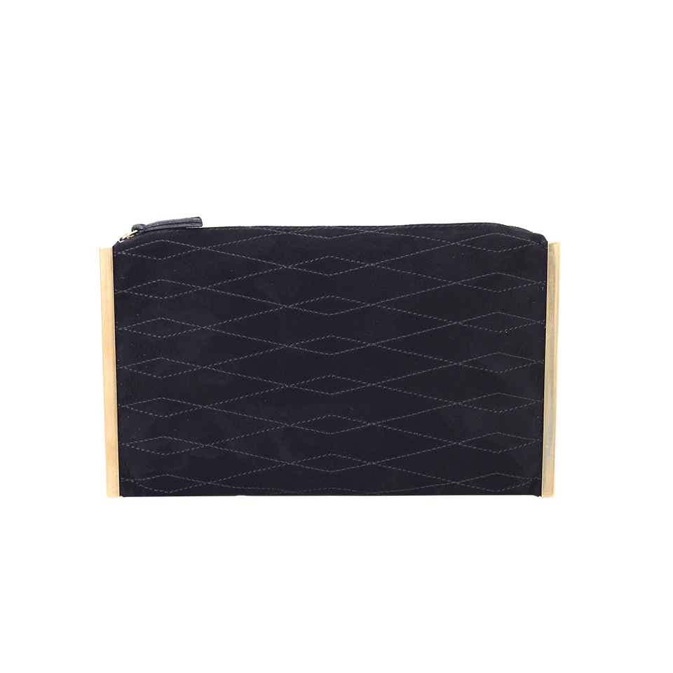 Gold Top Zip Closure With Quilted Suede Design, Solid Gold Metal Siding, And Black Satin Lining