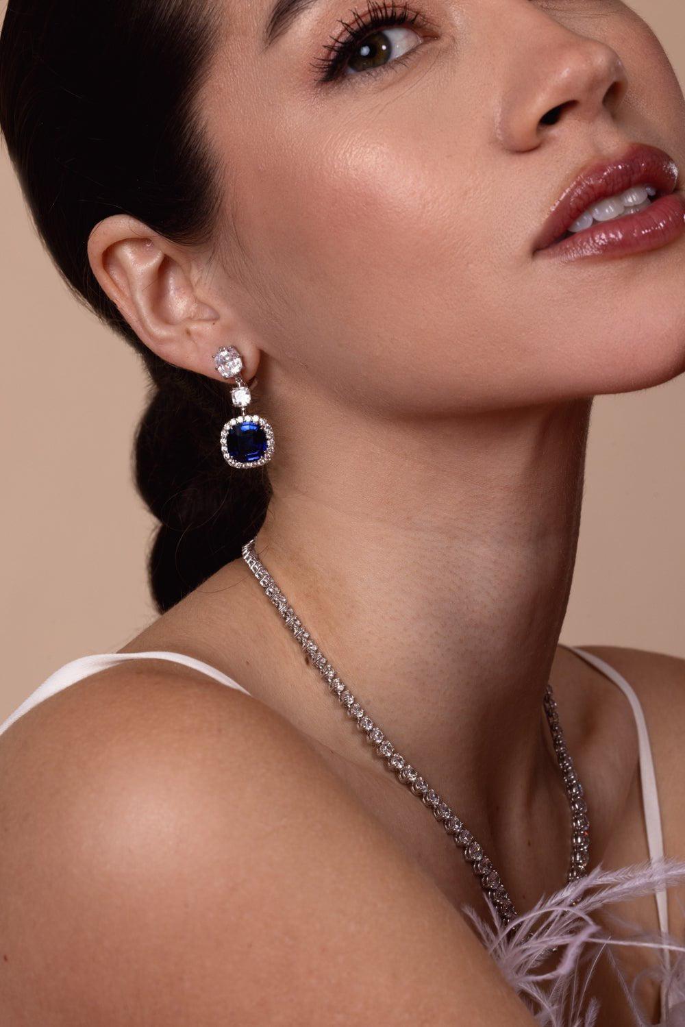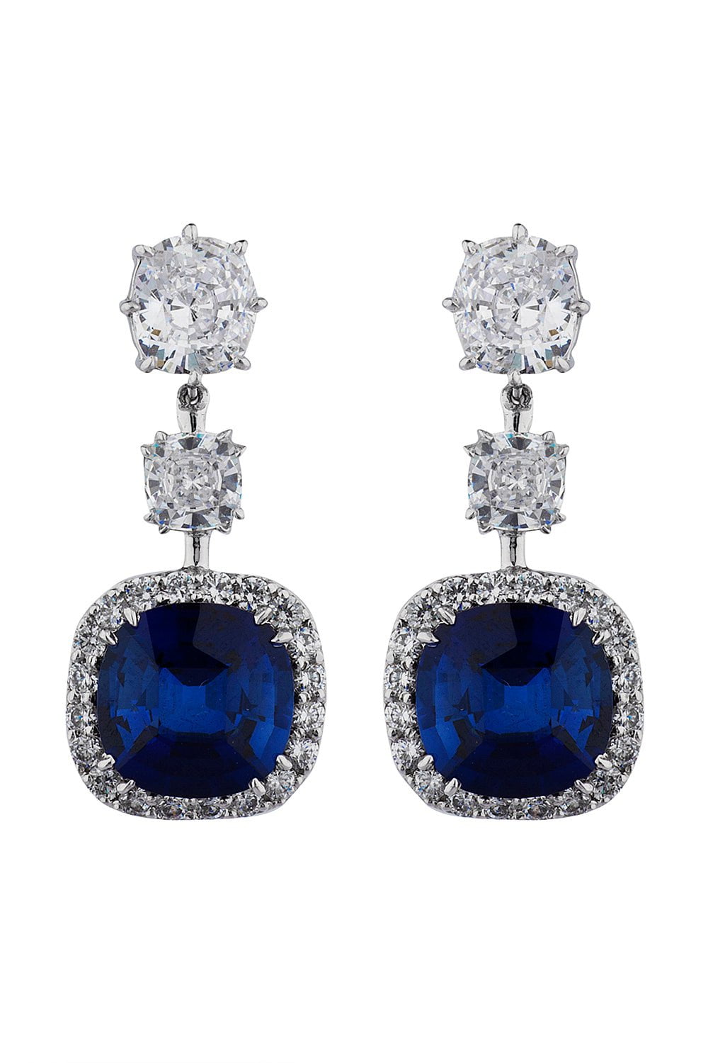 Fantasia by Deserio triple cushion blue drop earring in white.