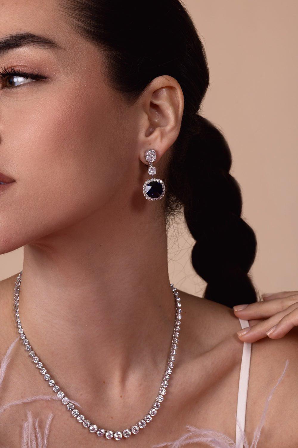 A stunning 1.5 and 1 carat colorless, cushion-cut cubic zirconia trail to an 8 carat show-stopping sapphire in a gorgeous halo drop setting. High quality vermeil throughout.