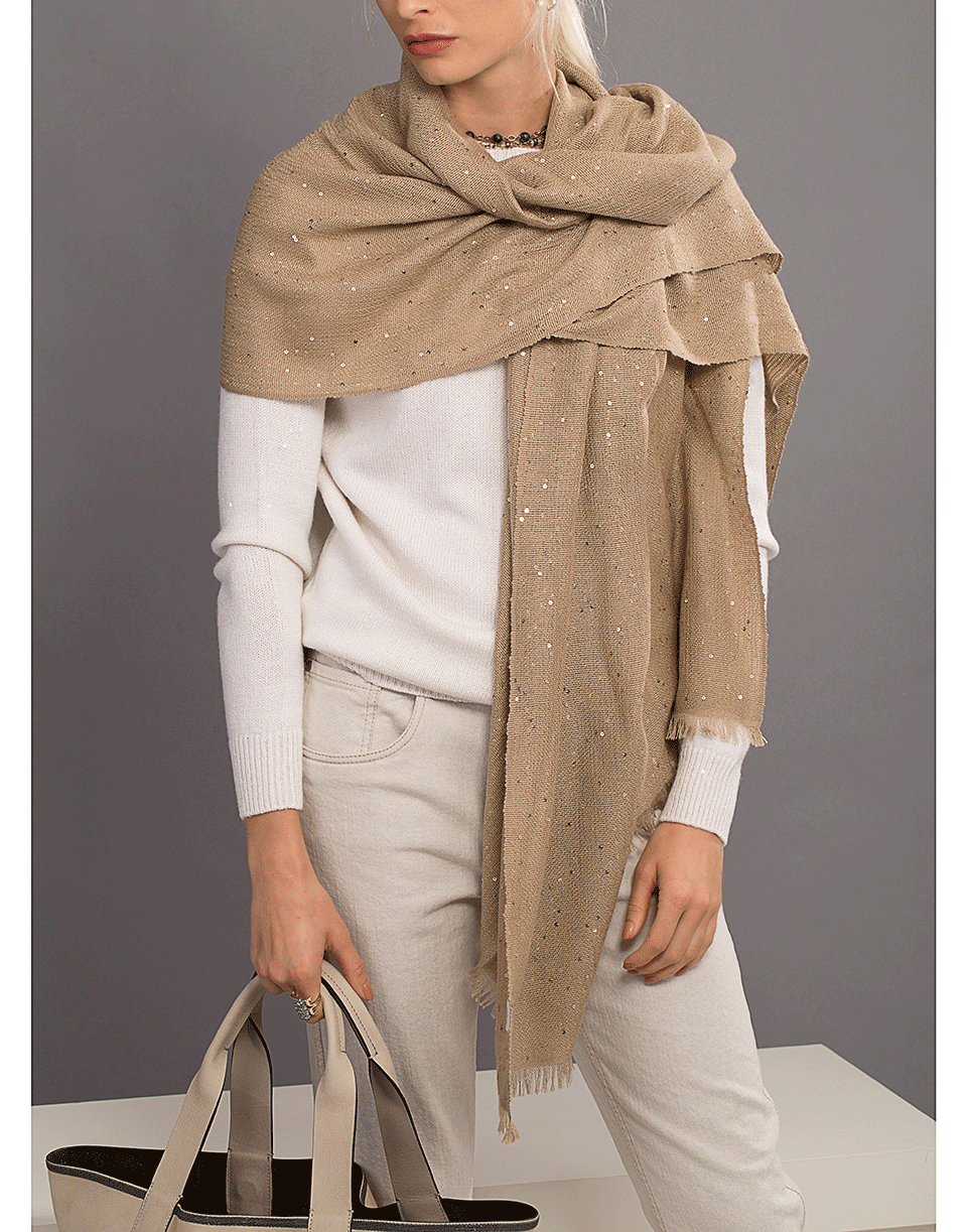 This Brunello Cucinelli scarf offers just enough comfort and sophistication, featuring a hint of sparkle with scattered paillettes on a blend of soft luxurious cashmere and silk.
