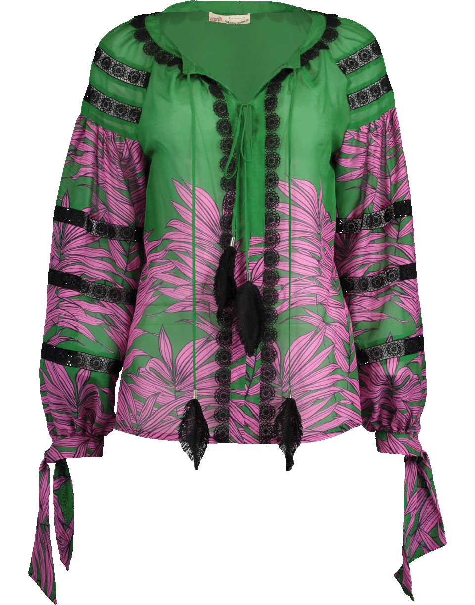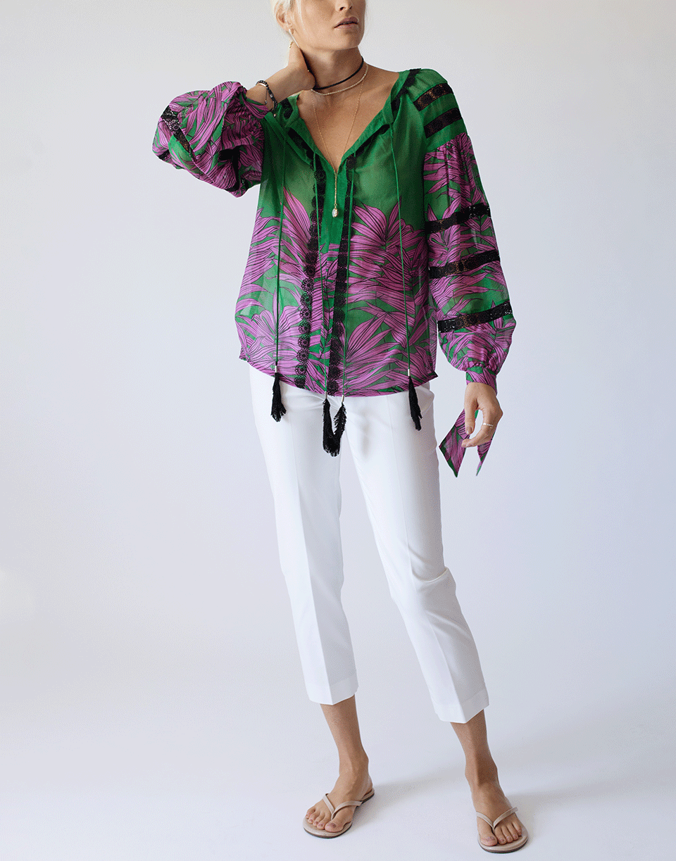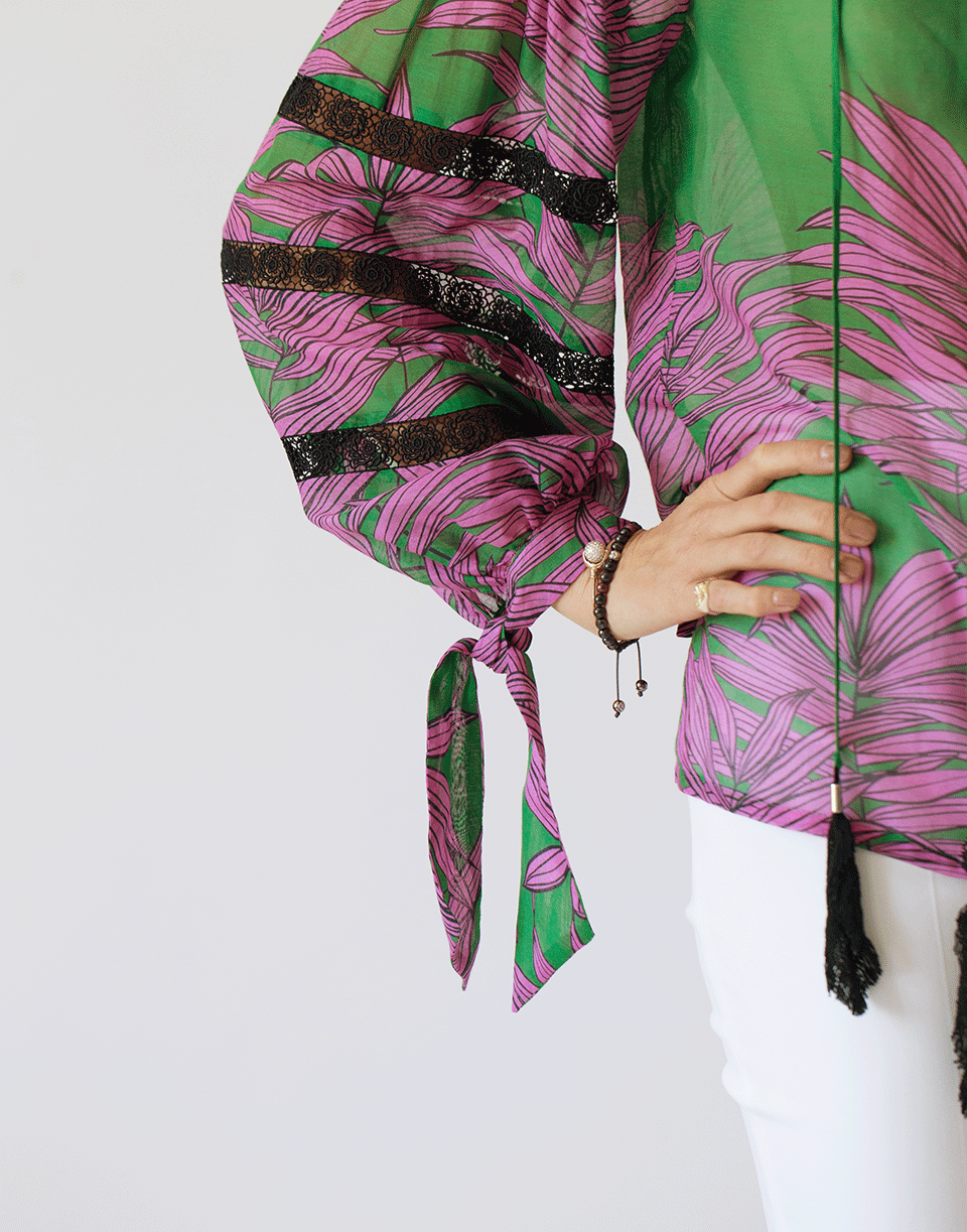 Feather tie front blouse by Maison Common. This green and pink silk-blend blouse features a v-neckline with feather tassels at ends, voluminous balloon long sleeves, tie cuffs, lace accents, straight hem, regular fit, and a pullover style.