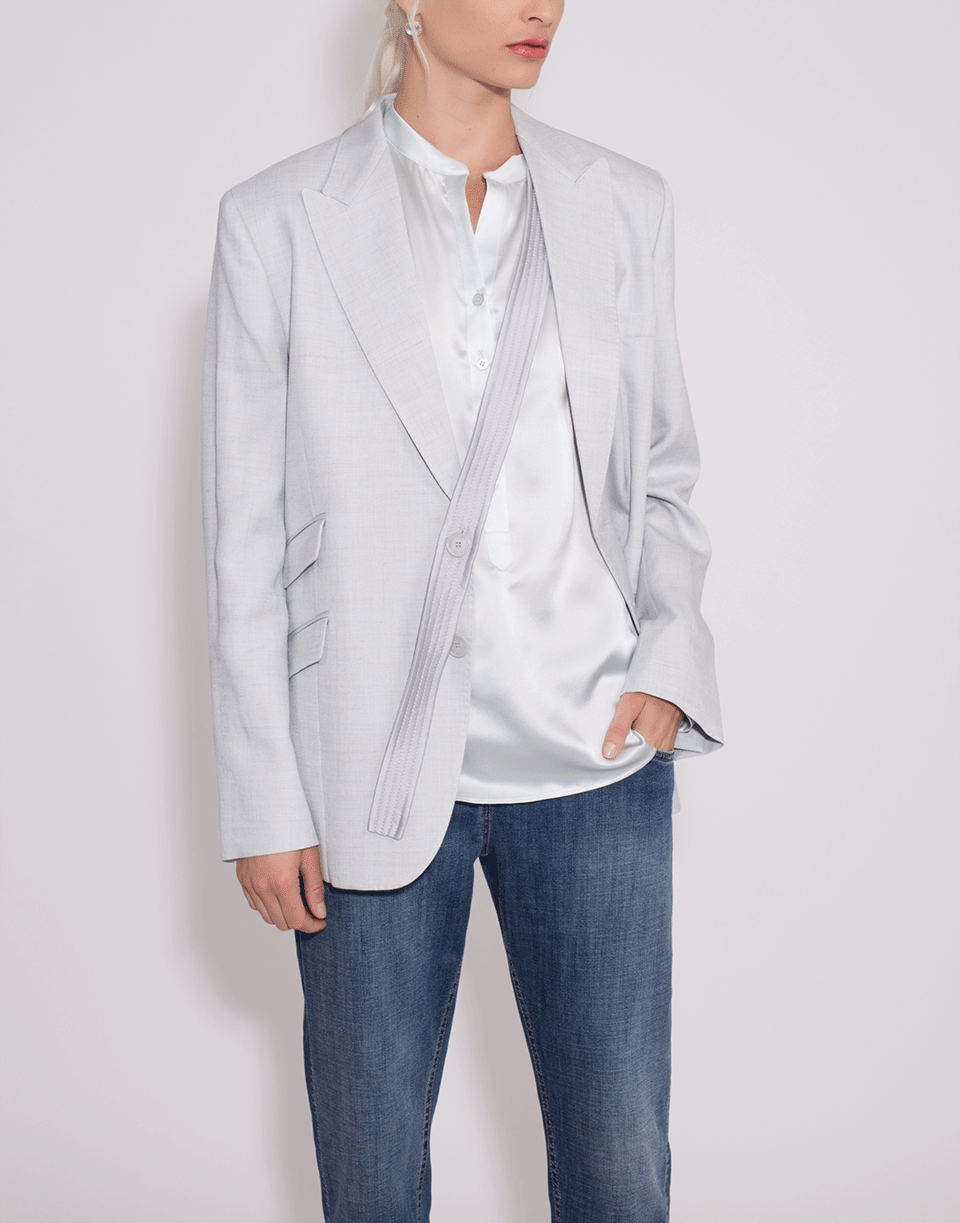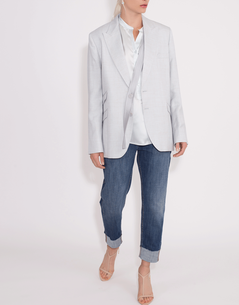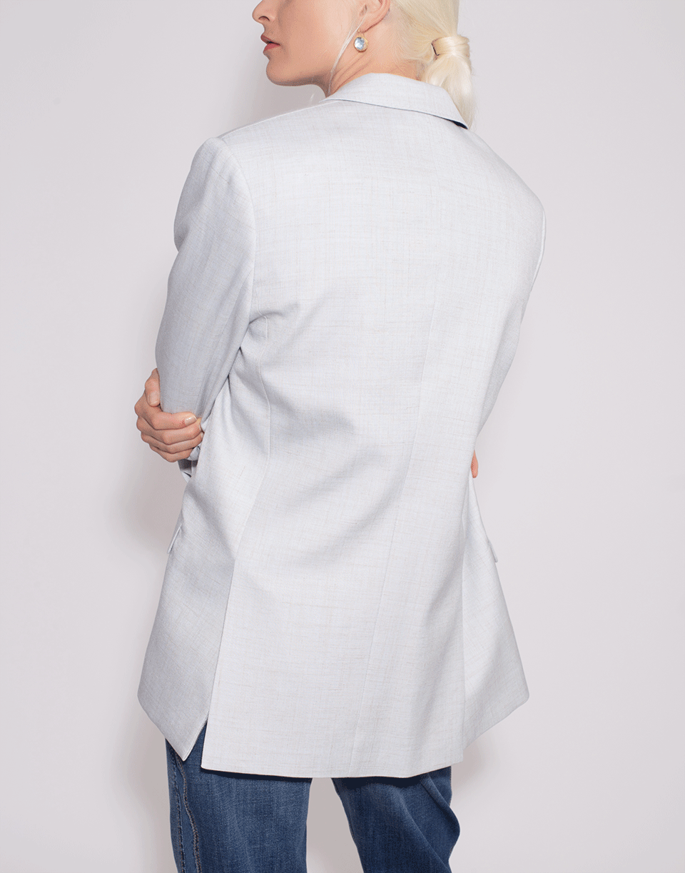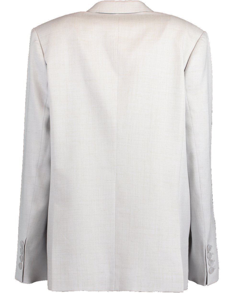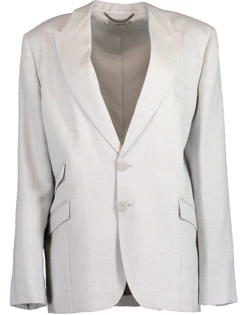 Light grey oversized jacket by Stella McCartney. This linen-blend blazer features an oversized boyfriend fit, long sleeves, peaked lapels, button cuffs, welt and flap pockets and two tonal button front.