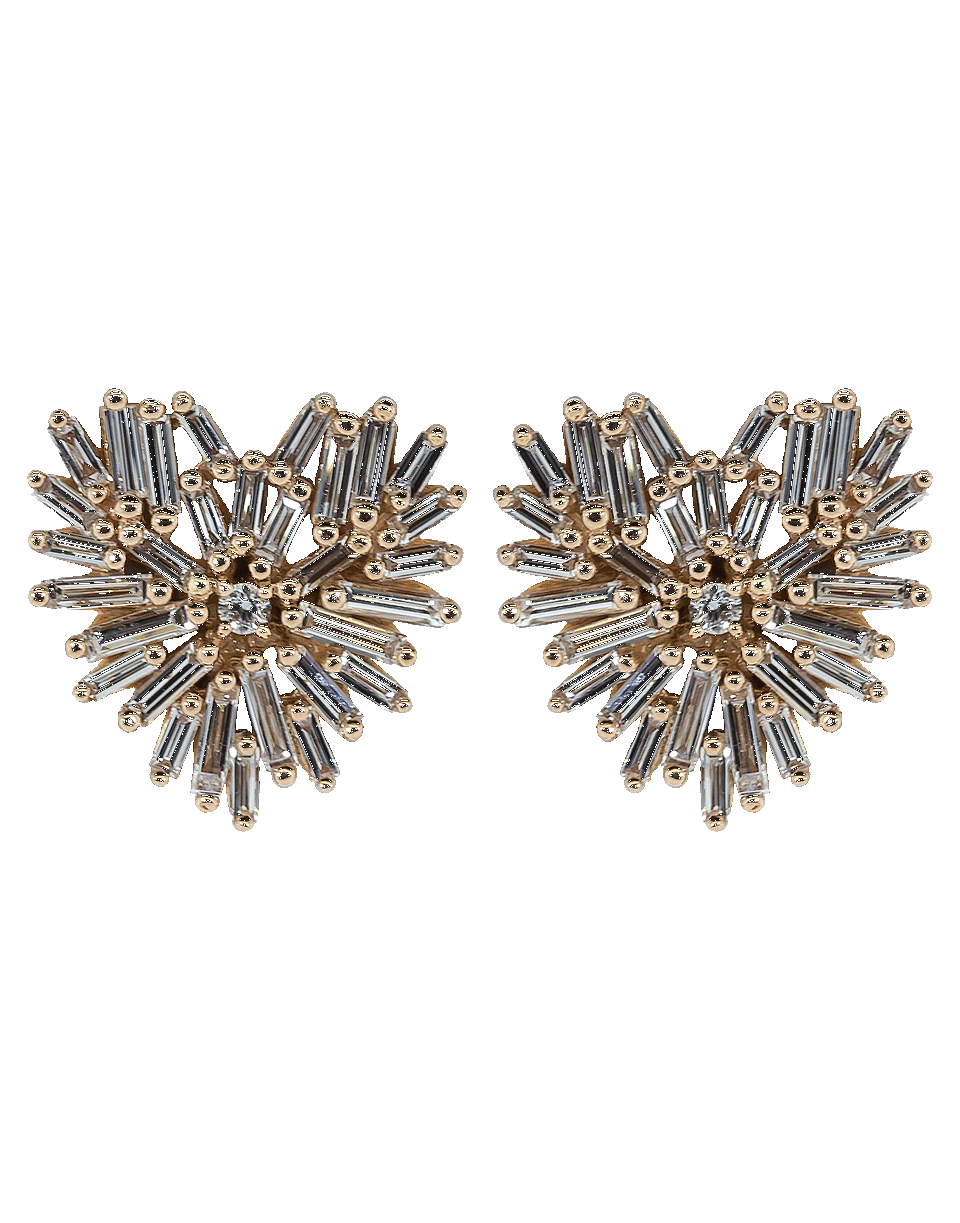 Suzanne Kalan post heart earrings with white diamond baguettes and white diamond round center on fireworks setting. For pierced ears.