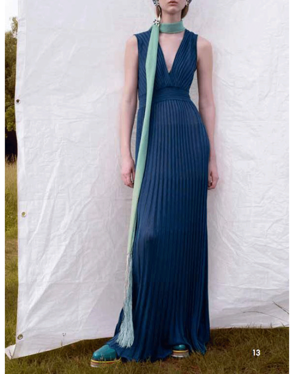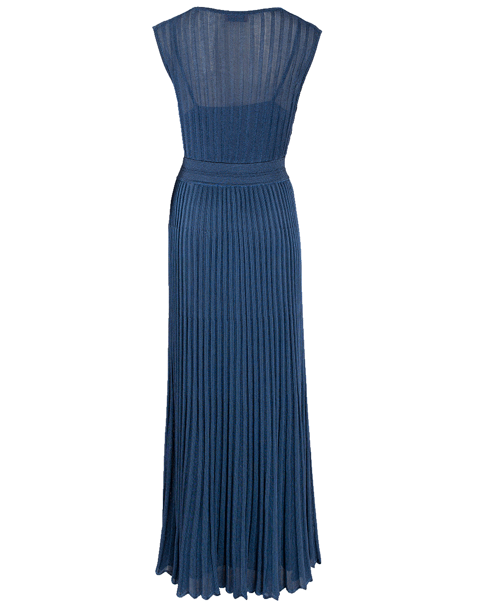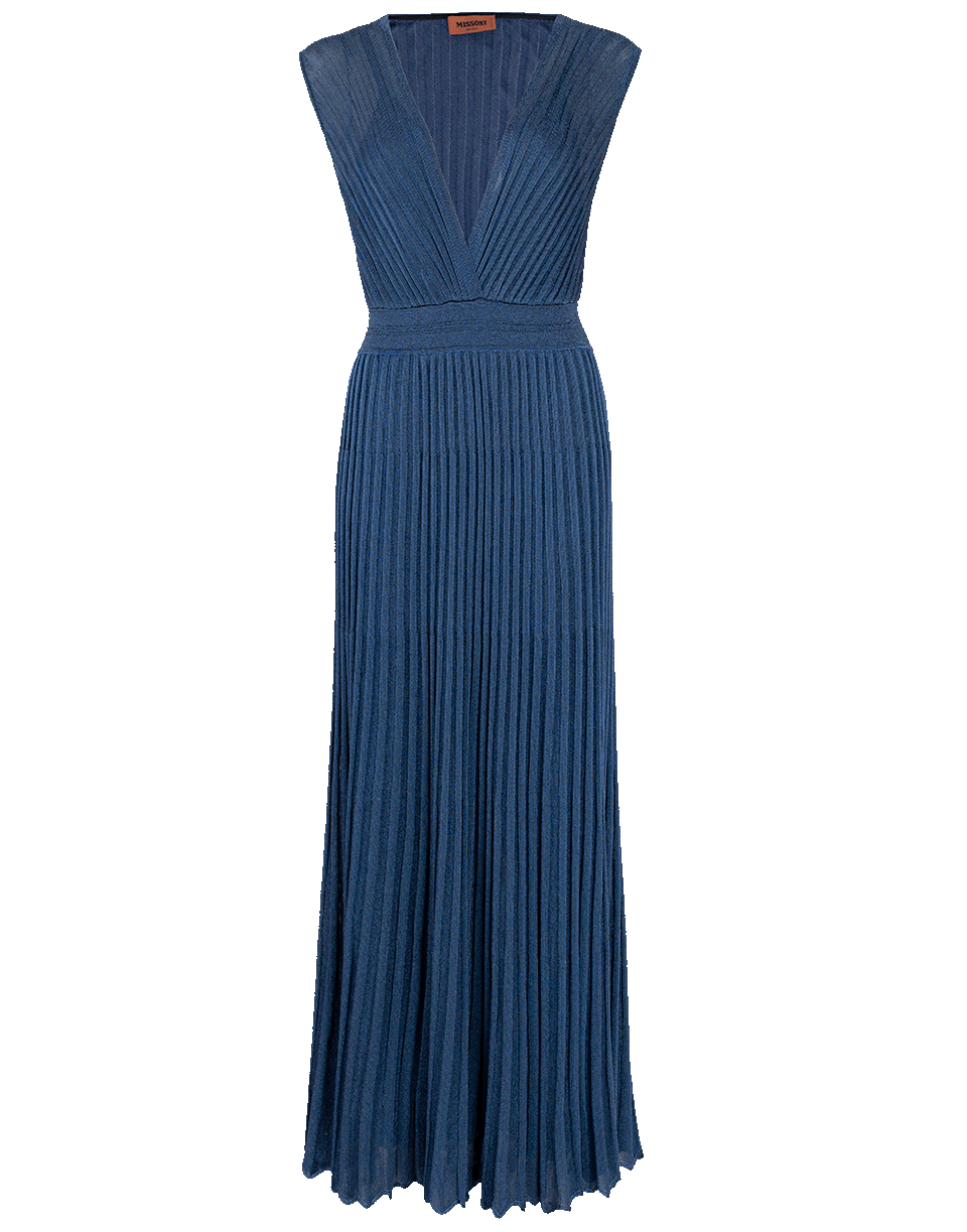 Fitted dress by Missoni. This no fuss maxi dress slips on with ease. It features a beautiful deep blue hue with a flattering empire waistline and plunging neckline, its focal point is on the delicate shimmering pleats that elegantly sway as you walk.