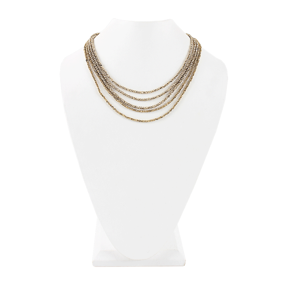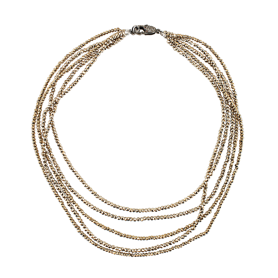 Layers on layers, this five stranded gold pyrite necklace by Jordan Alexander is to die for. Its rustic yet regal essence makes for a stunning accessory to brighten up the darkest of days.