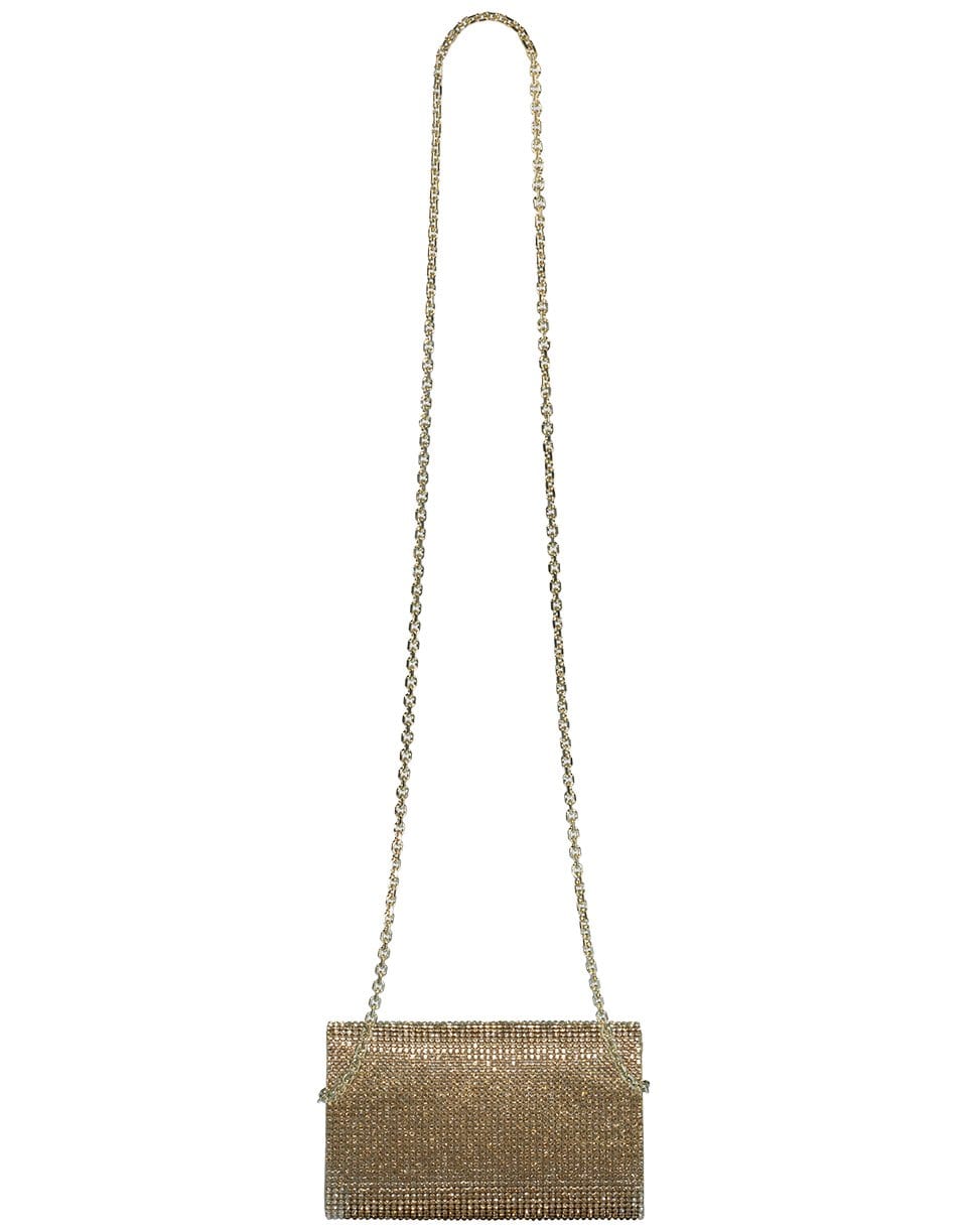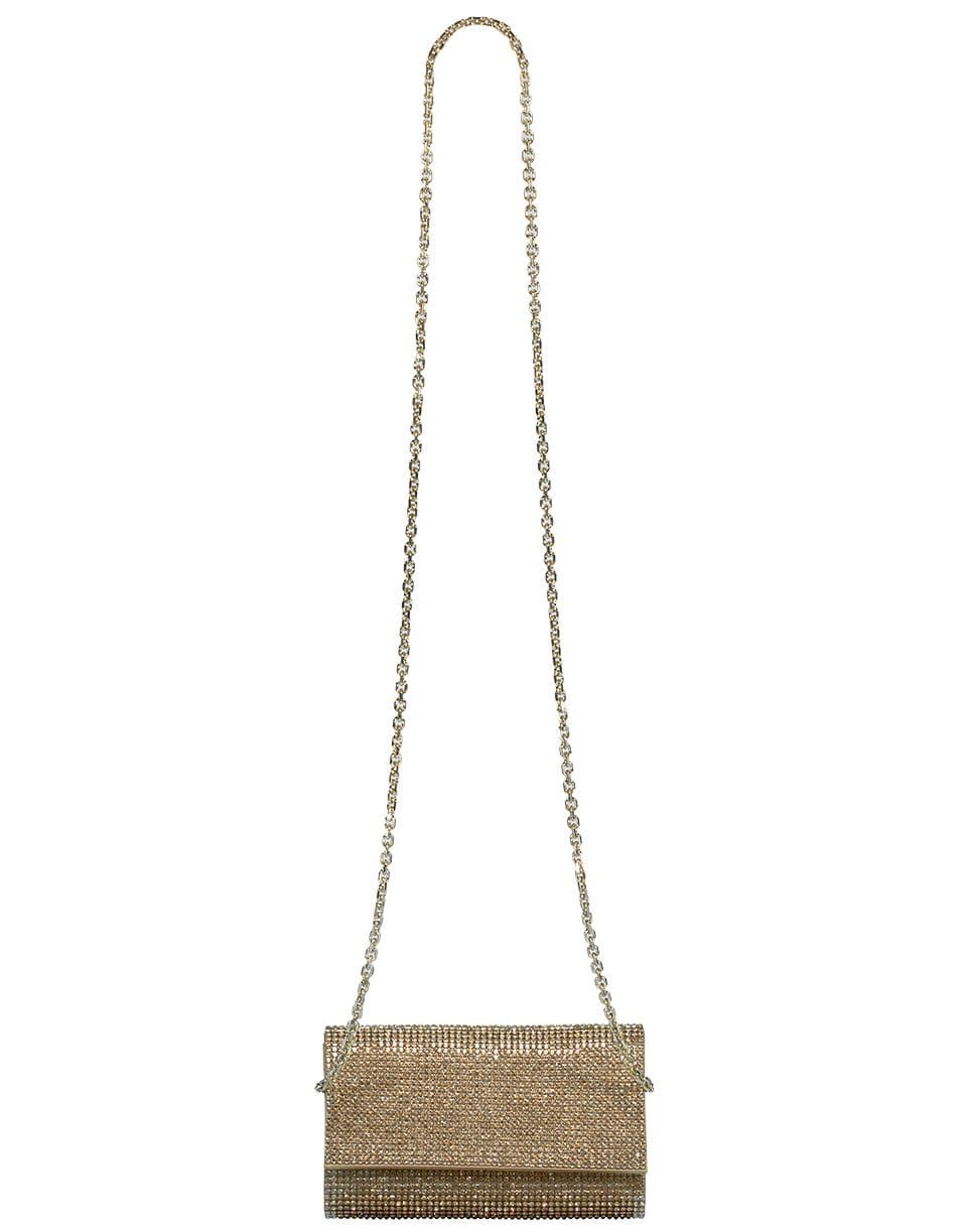 Judith Leiber Couture Italian satin lined clutch encrusted with prosecco faceted crystals and finshed with a magnetic snap closure and a removable crossbody chain.