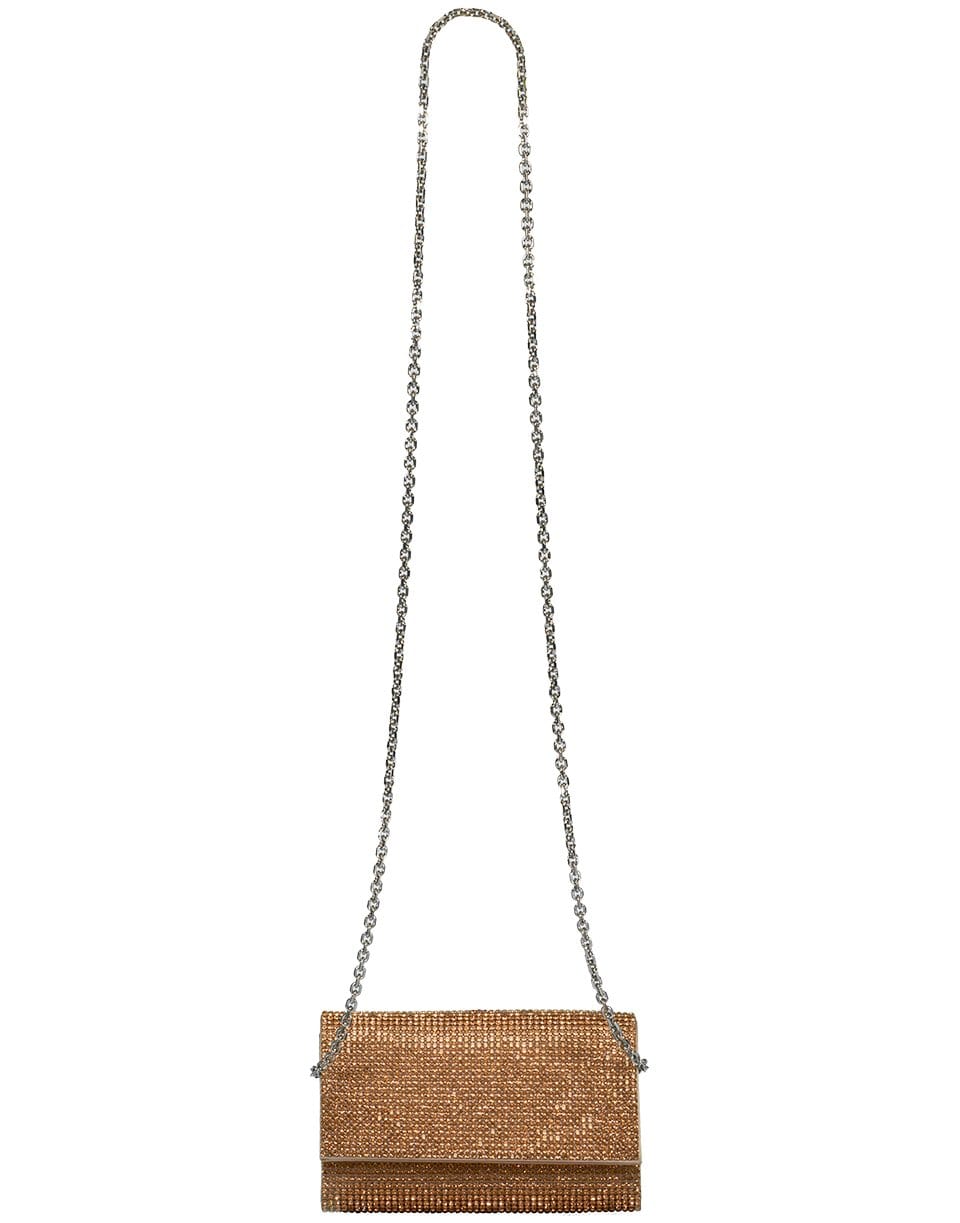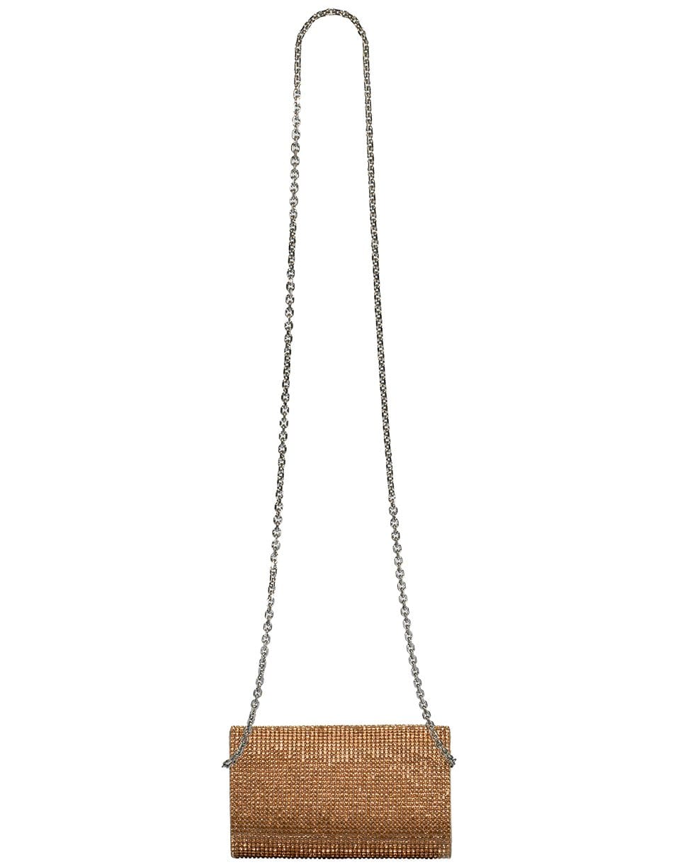 Judith Leiber Couture Italian satin lined clutch encrusted with rose gold faceted crystals and finshed with a magnetic snap closure and a removable crossbody chain.