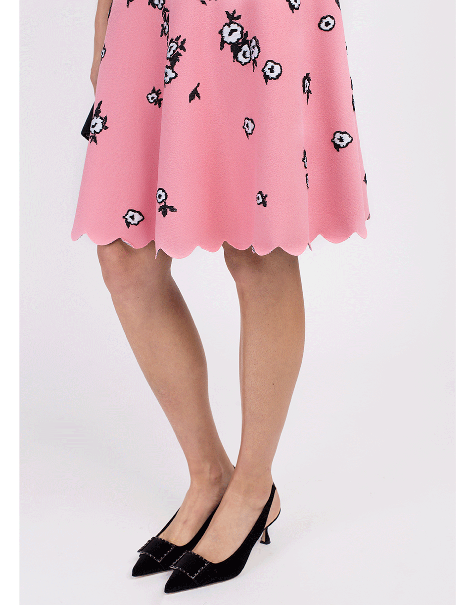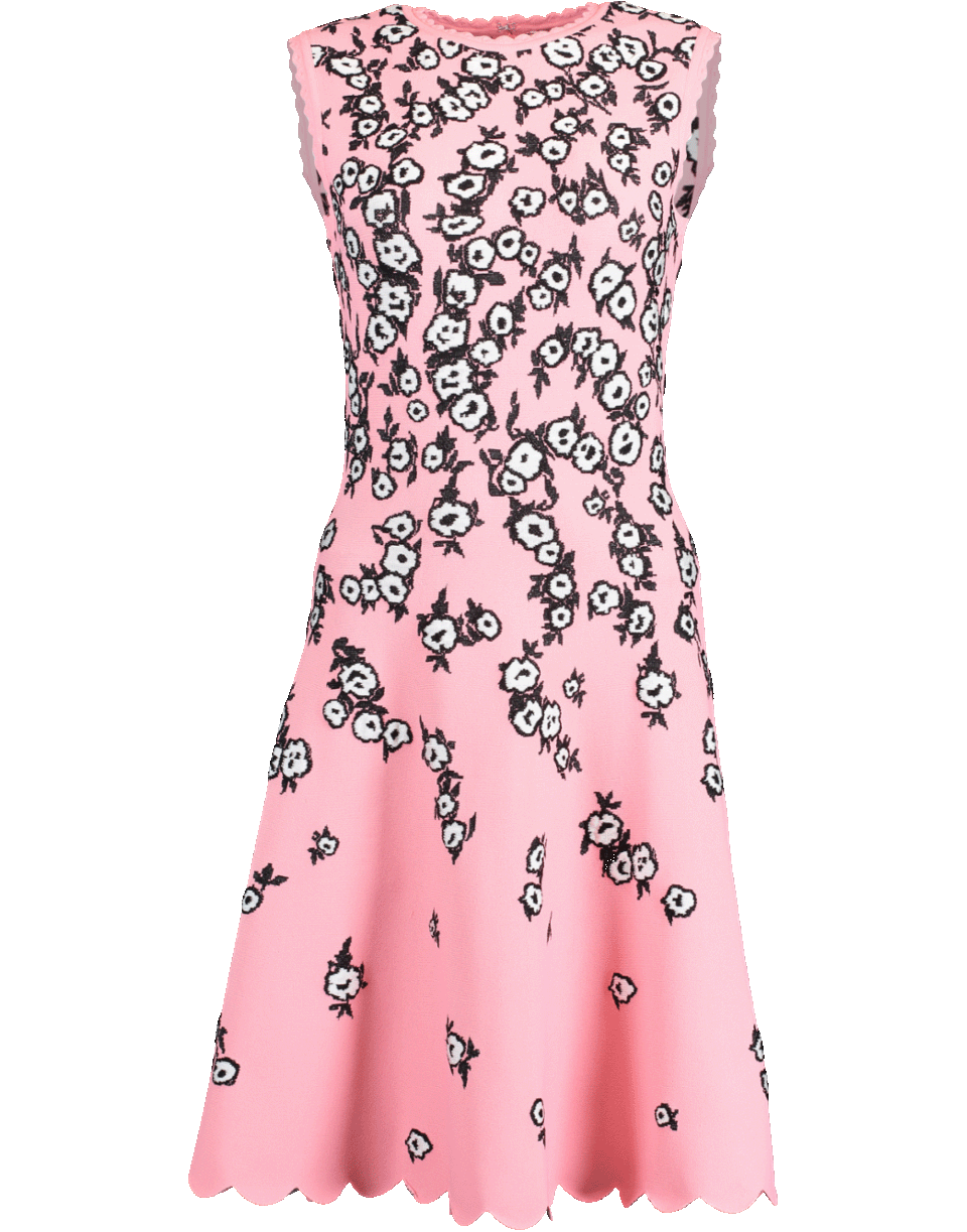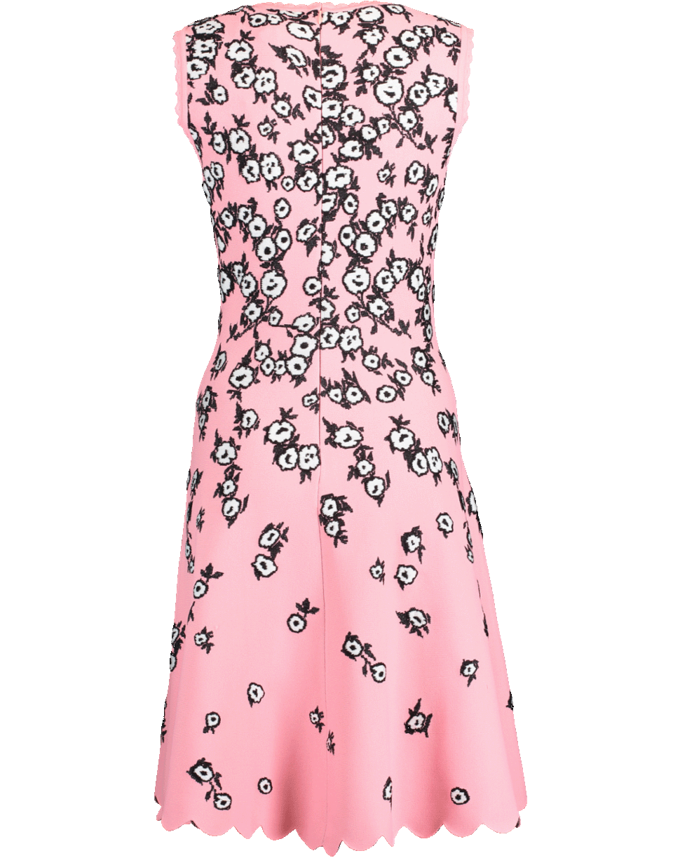 Floral print jacquard knee length dress from Carolina Herrera featuring an A-line sleeveless cut with a round neckline, concealed back zip closure, and finished with scalloped trims.