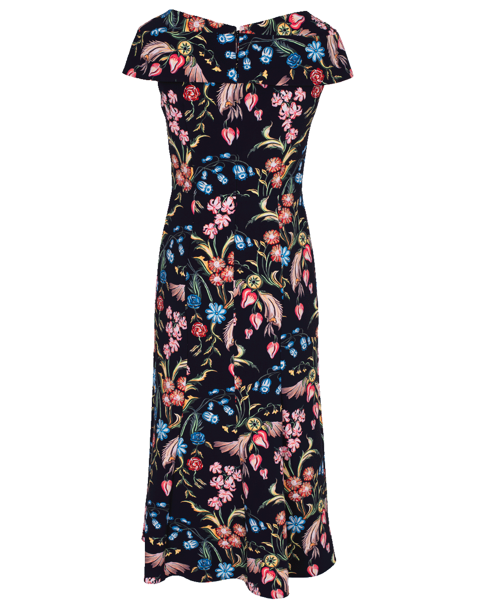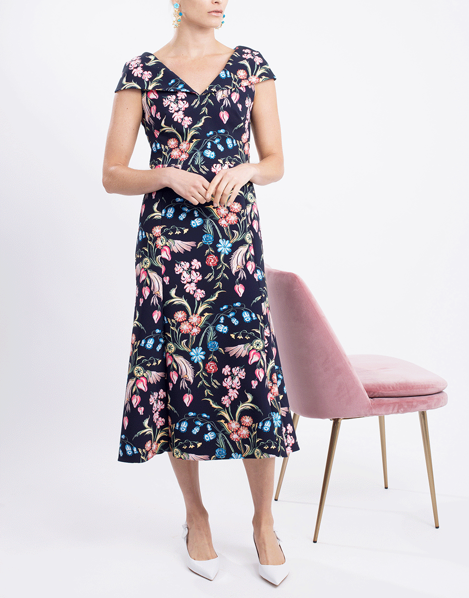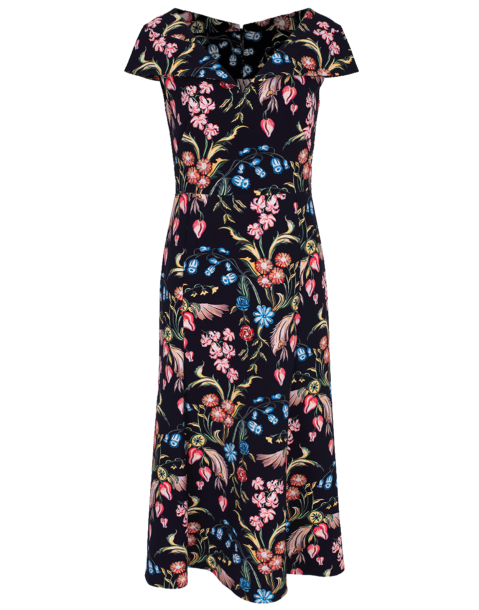Navy floral print dress from Peter Pilotto featuring a mid-length, slim fit, slightly flared skirt, v-neckline, cap sleeves, and a concealed zip closure at back.