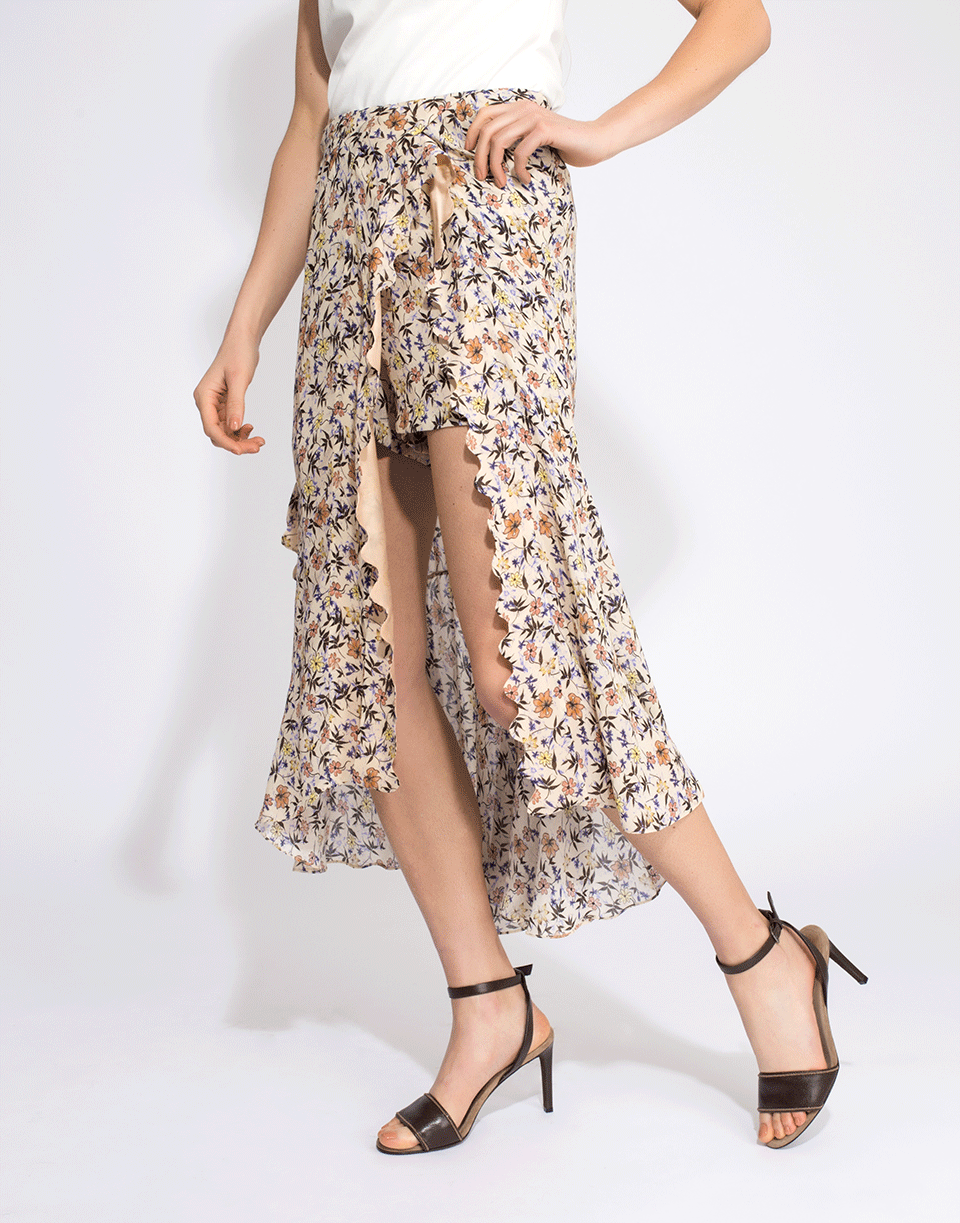 Floral print skort by Chloe. This floral skort features a frontal vent with ruffle details and zip fastening. Interior shorts allow for a comfortable fit and movement throughout the skirt.