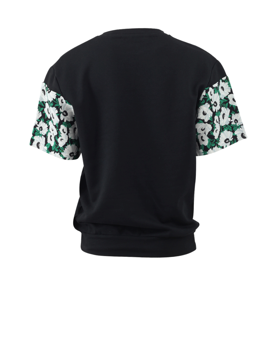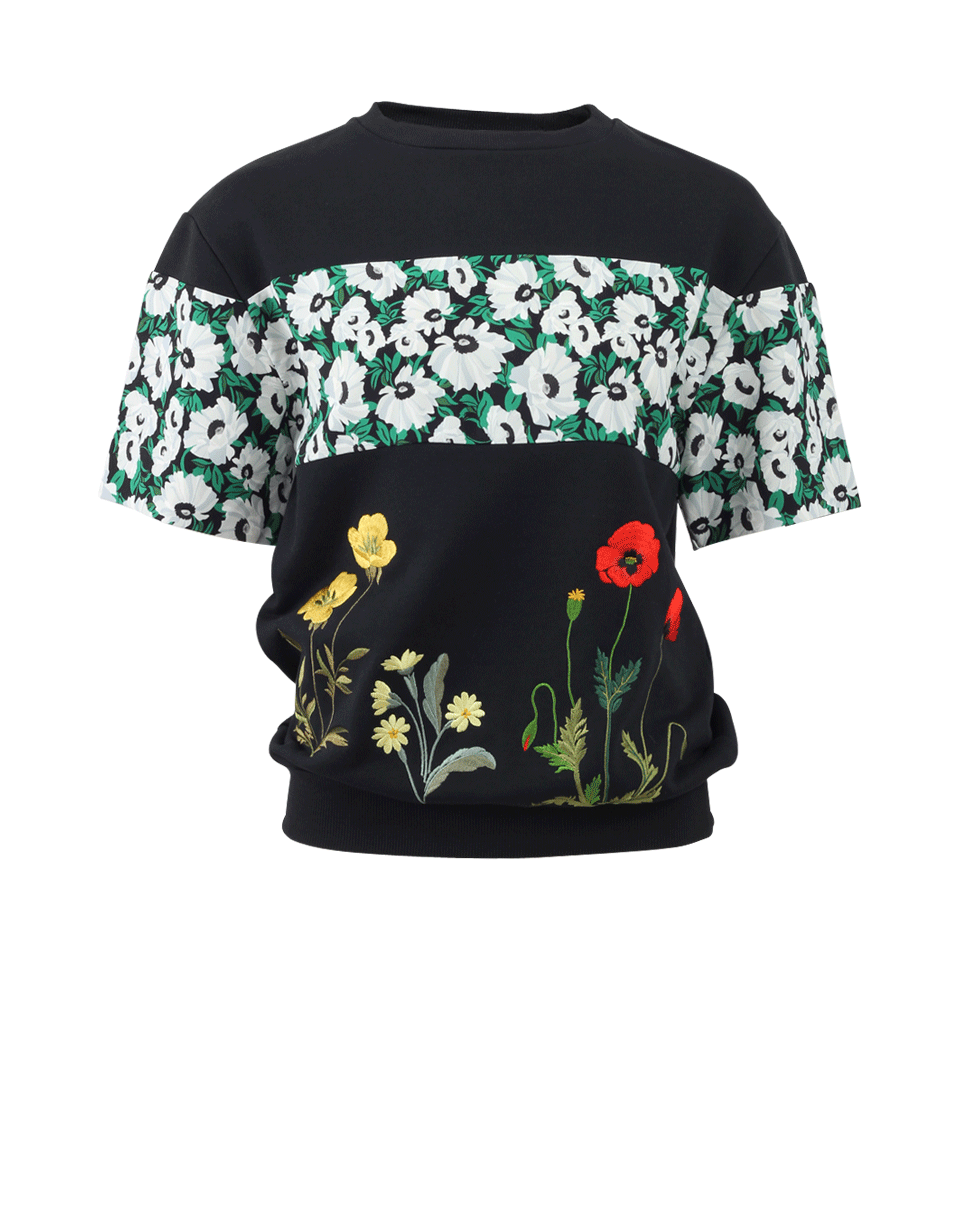 Crew Neckline With Contrast Floral Fabric Blocking, Embroidered Flowers