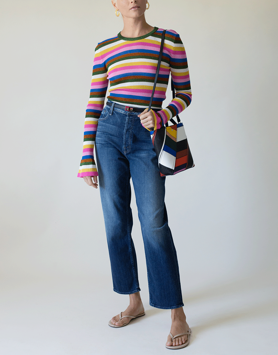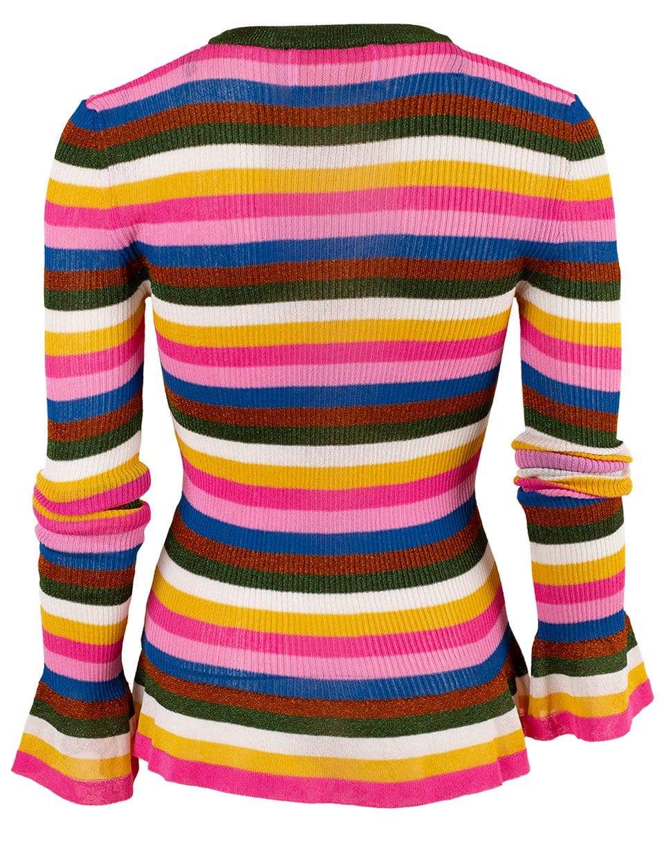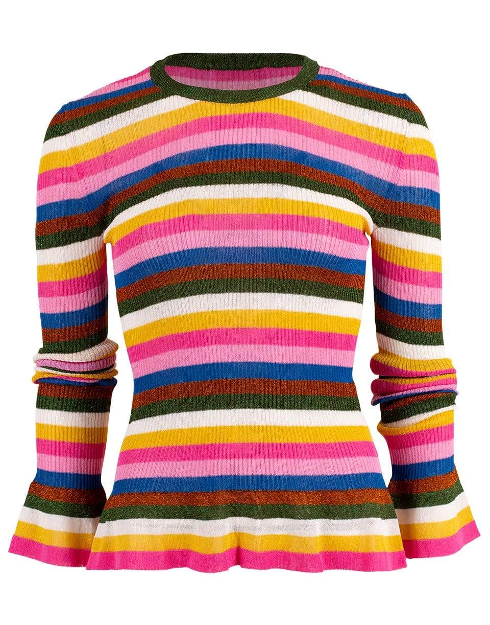 Metallic multicolor striped knit flute top by La Double J. This knit top is perfect if you love to layer. The fluted sleeves give an extra flare to your look.