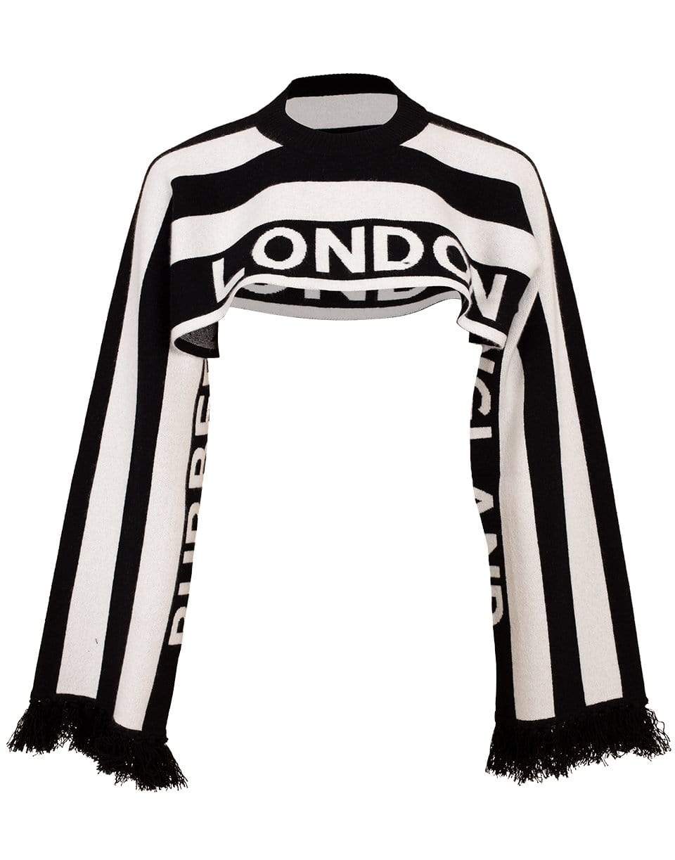 Cotton Burberry football scarf with headhole, ribbed crewneck, and finged ends.