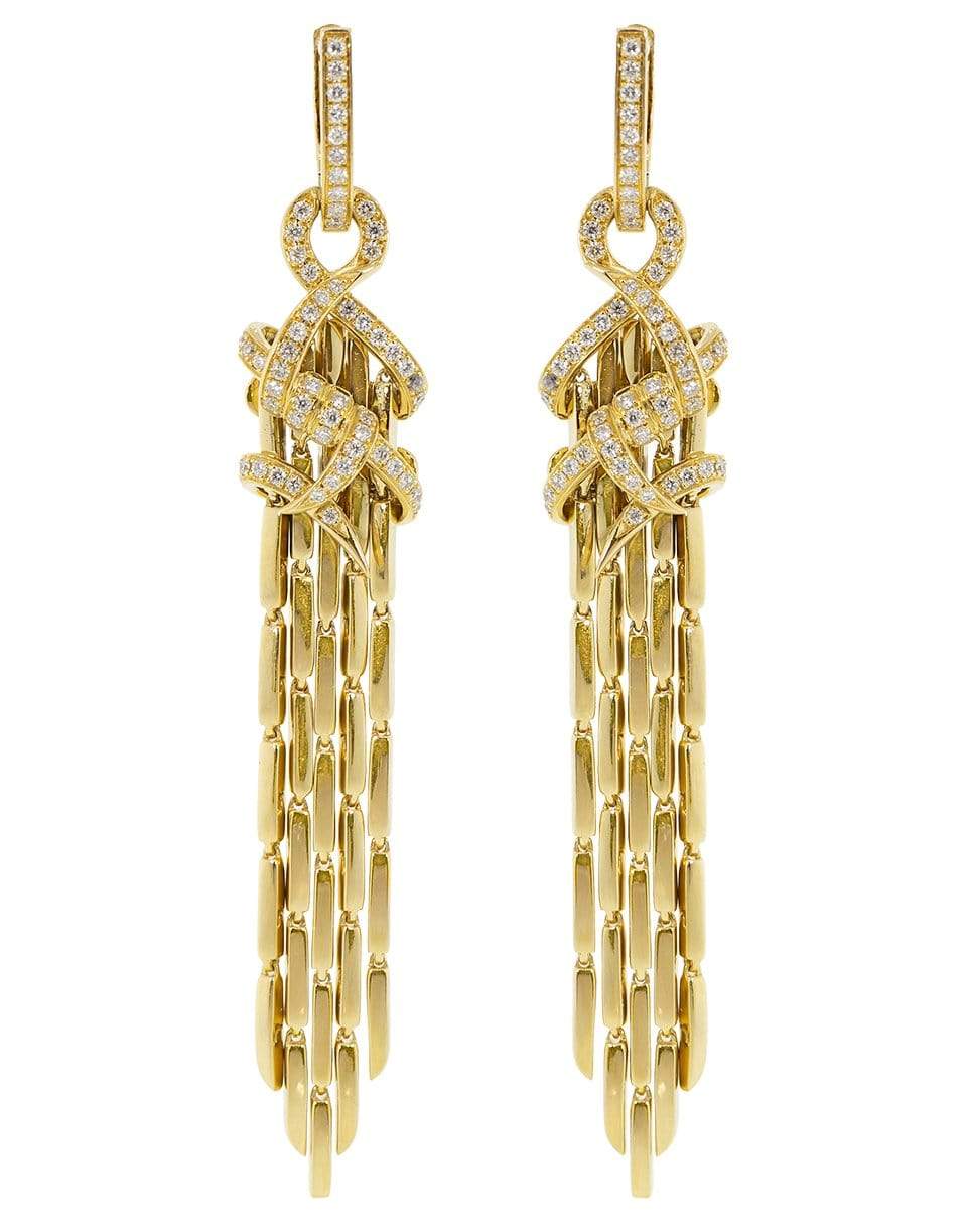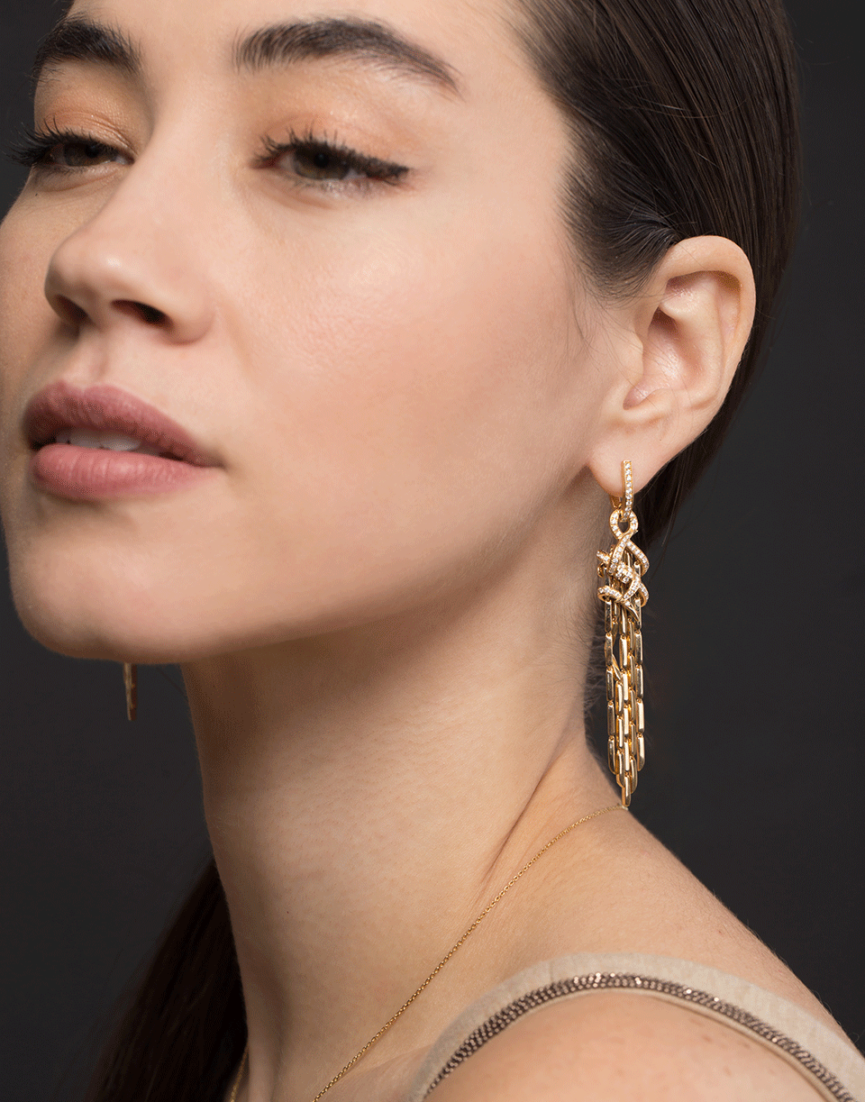Stephen Webster Forget Me Knot cascade diamond earrings with white pave diamonds.