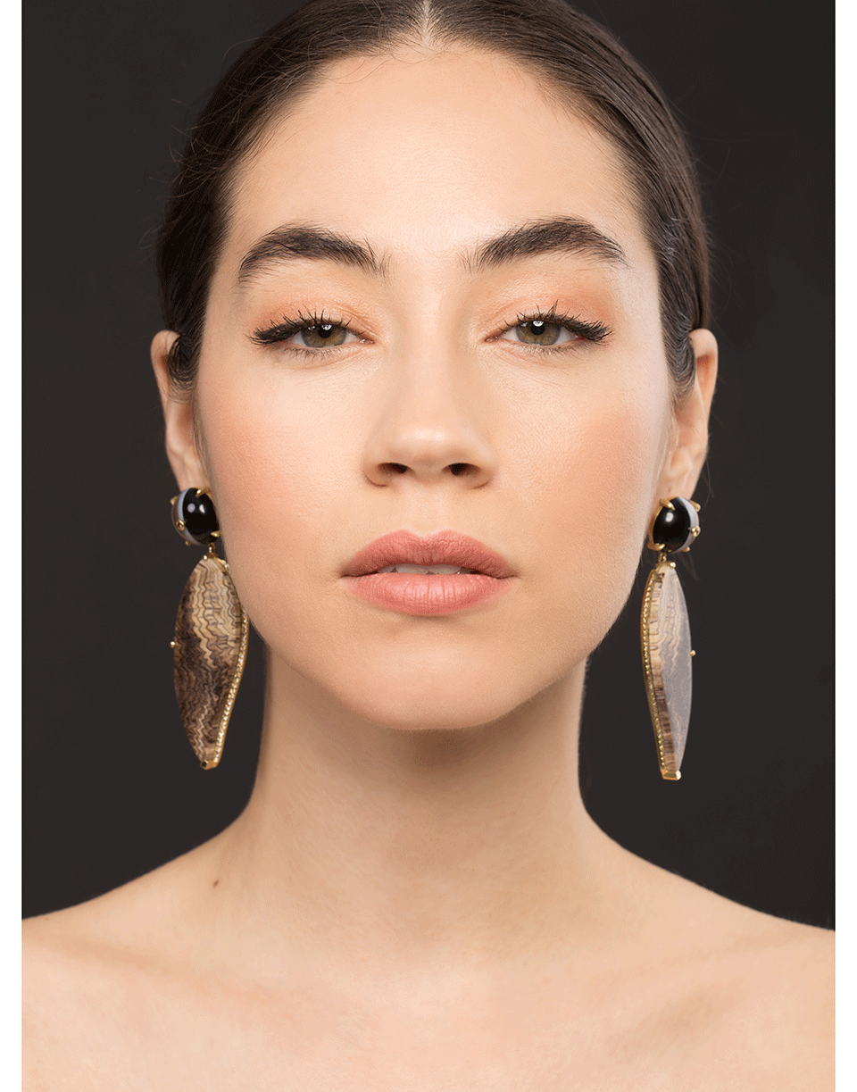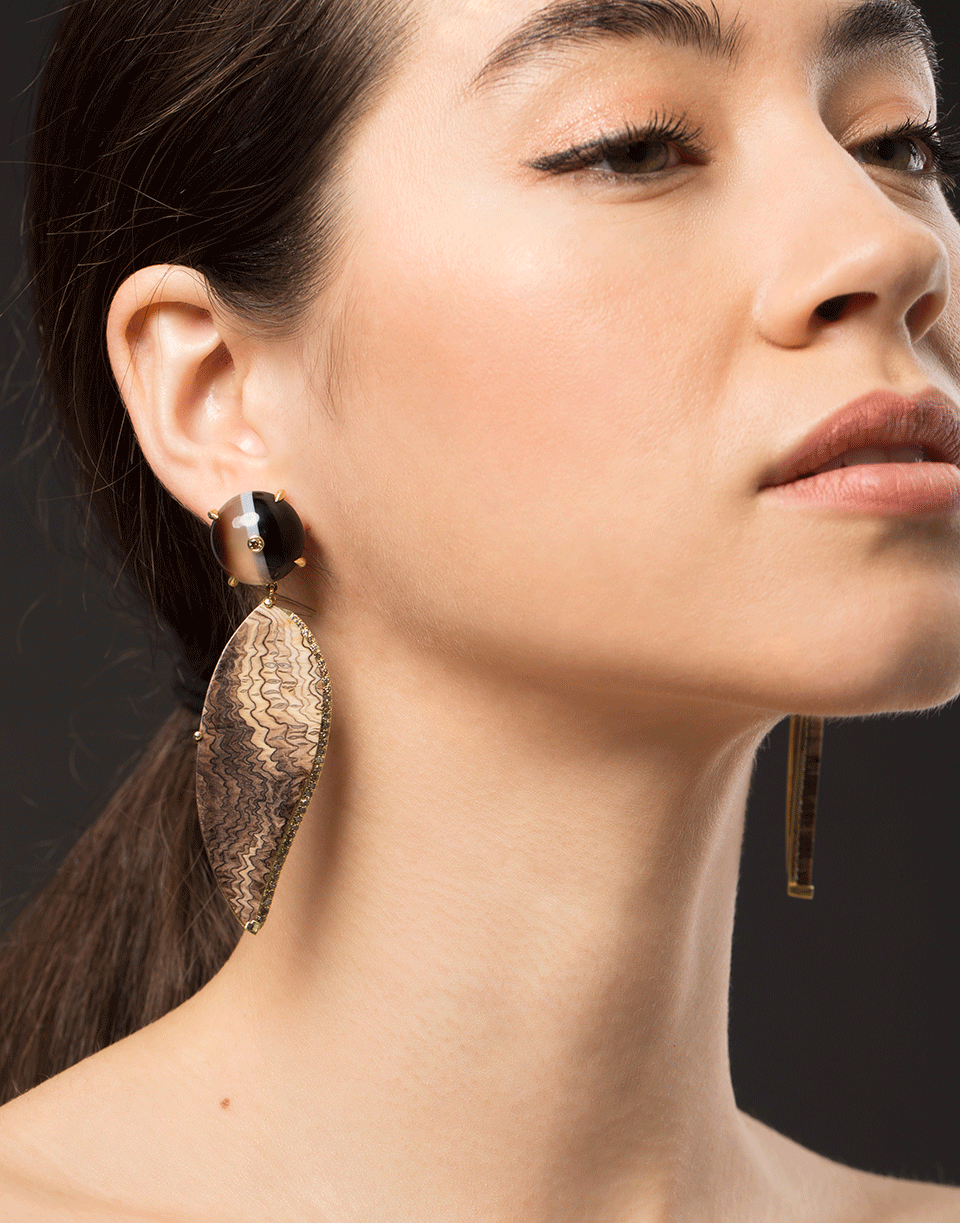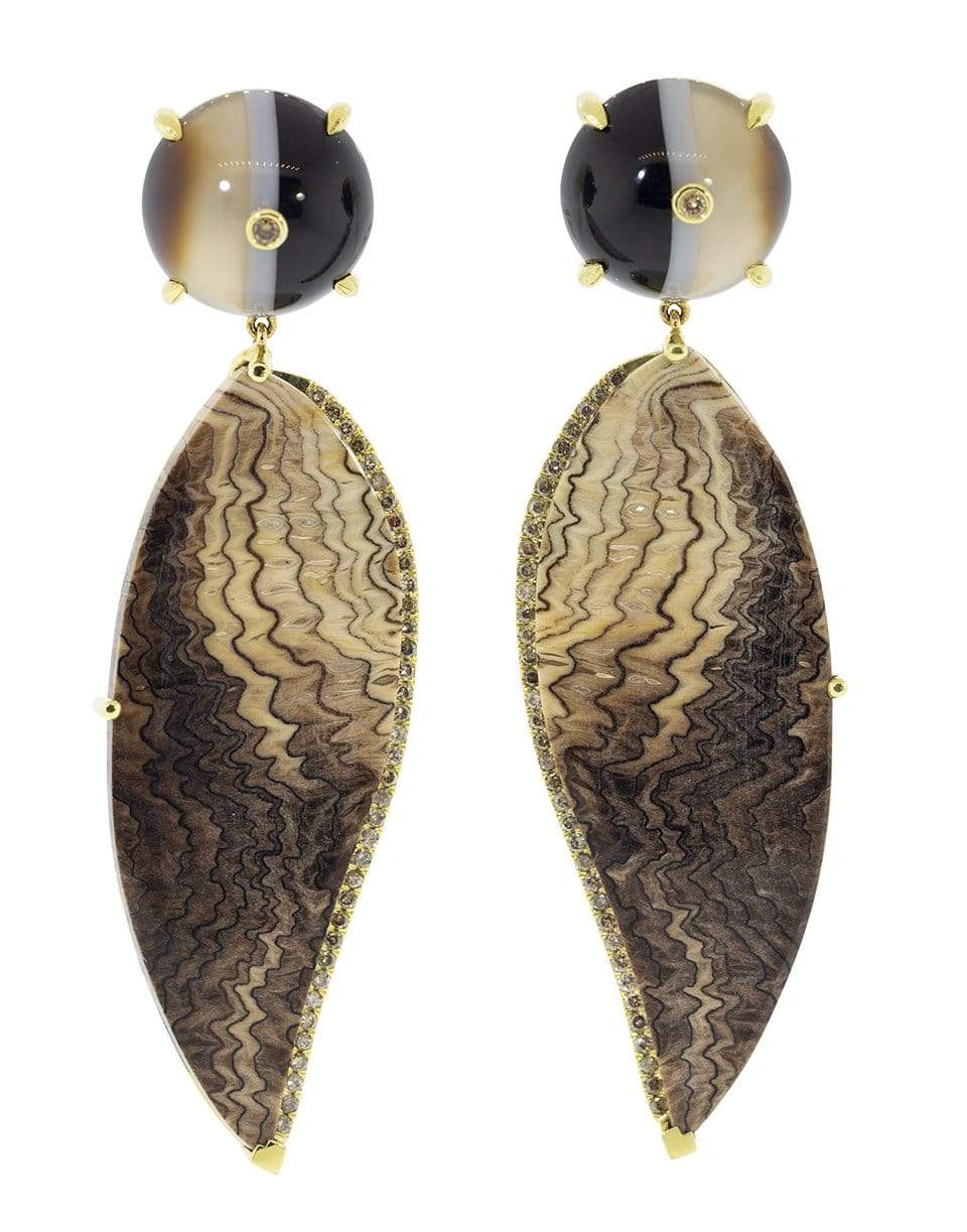 Guita M fossil sequoia earrings with striped agate slices and diamonds set in 18k yellow gold. For pierced ears.