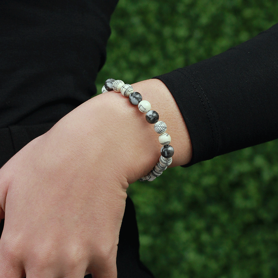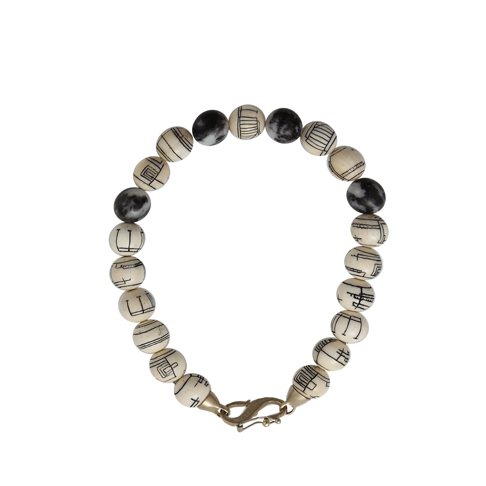 Fossilized Woolly Mammoth And Hand Carved Scrimshaw Bead Bracelet With Four Zebra Agate Beads From Monique Pean
