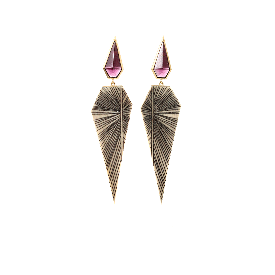 Fiercly edgy in sharp glamour, Monique Pean's fossilized woolly mammoth rhodolite earrings are fit for a warrior princess.