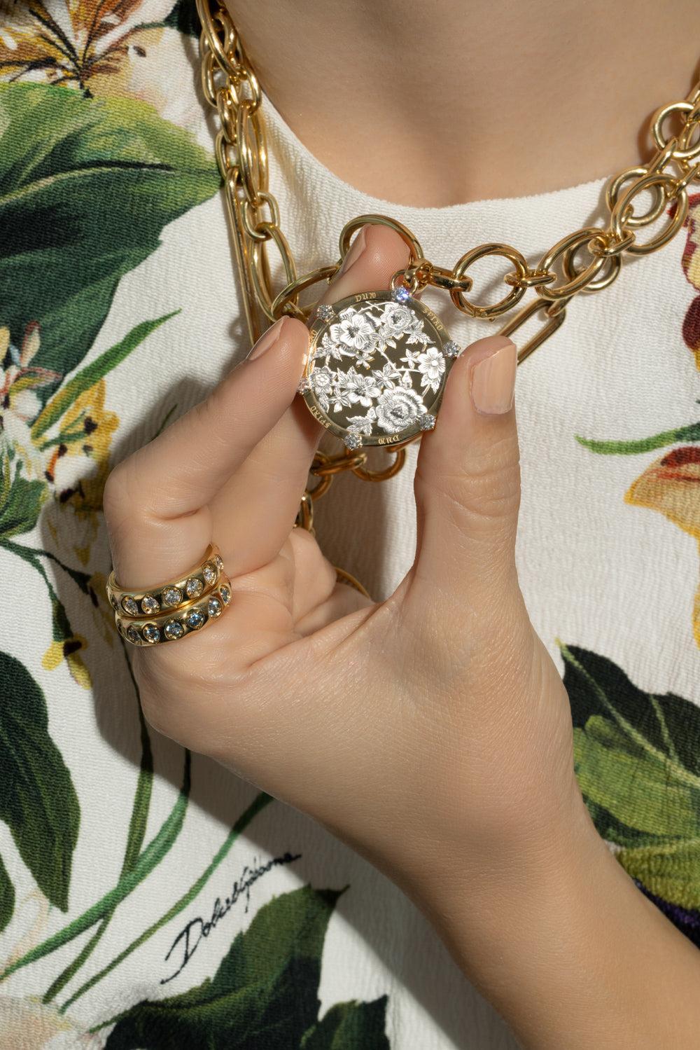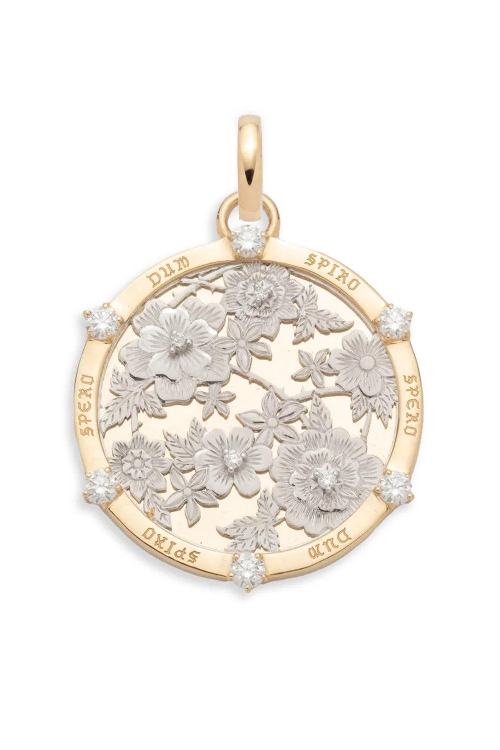 This medallion design was inspired by intricately carved decorative screens placed over a high shine gold surface, so that the gold shows through the etched-out parts of the floral latticework. Here, the white gold ground is a backdrop for the yellow gold and diamond blossoms. This design is also available in rose gold flowers on a yellow gold ground, and white gold flowers on a yellow gold ground.
