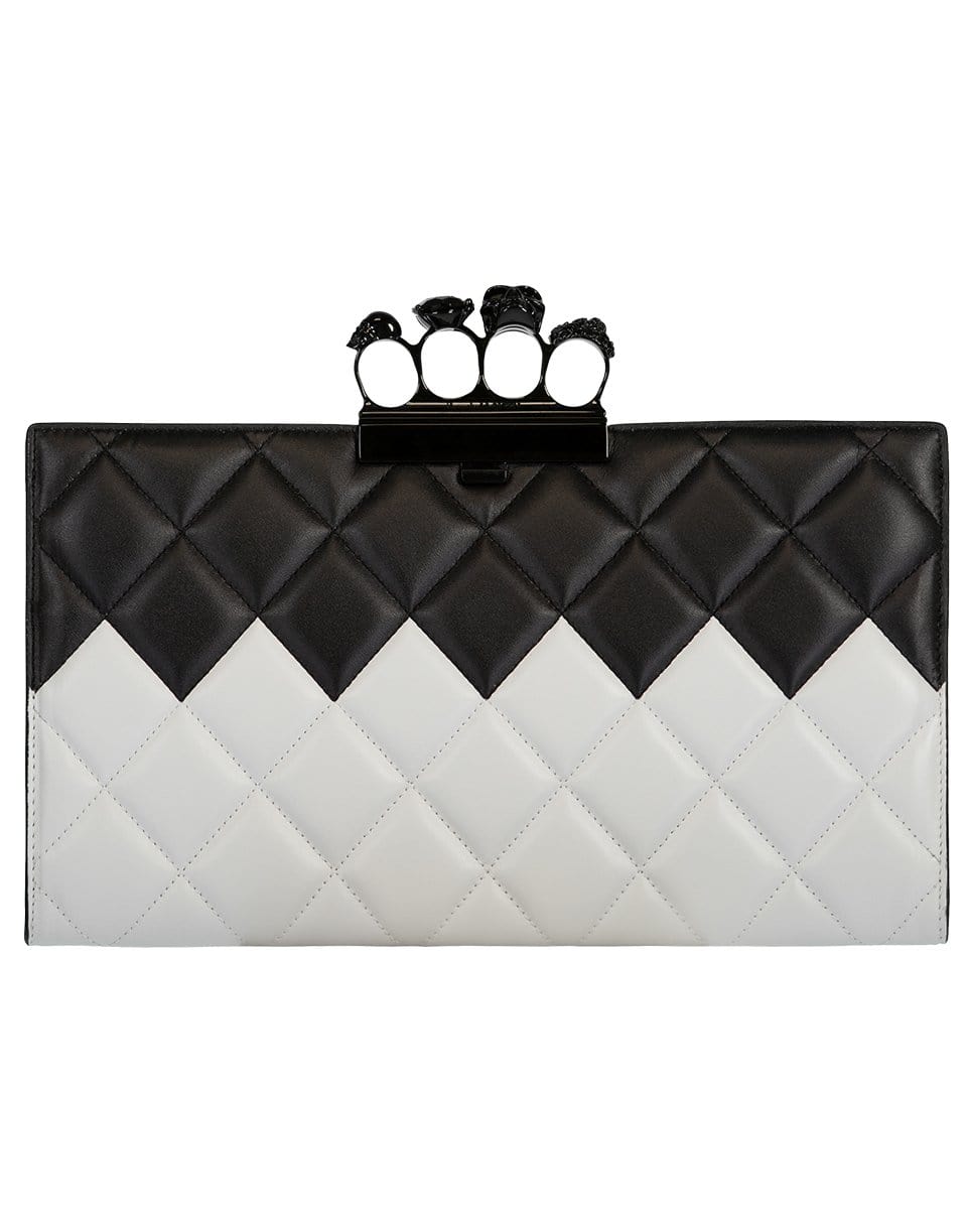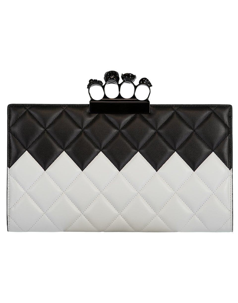 Black and white four ring knuckle clutch by Alexander McQueen featuring a quilted design with a clasp closure, interior zip pocket, gunmetal hardware and a four-ring detail on top.