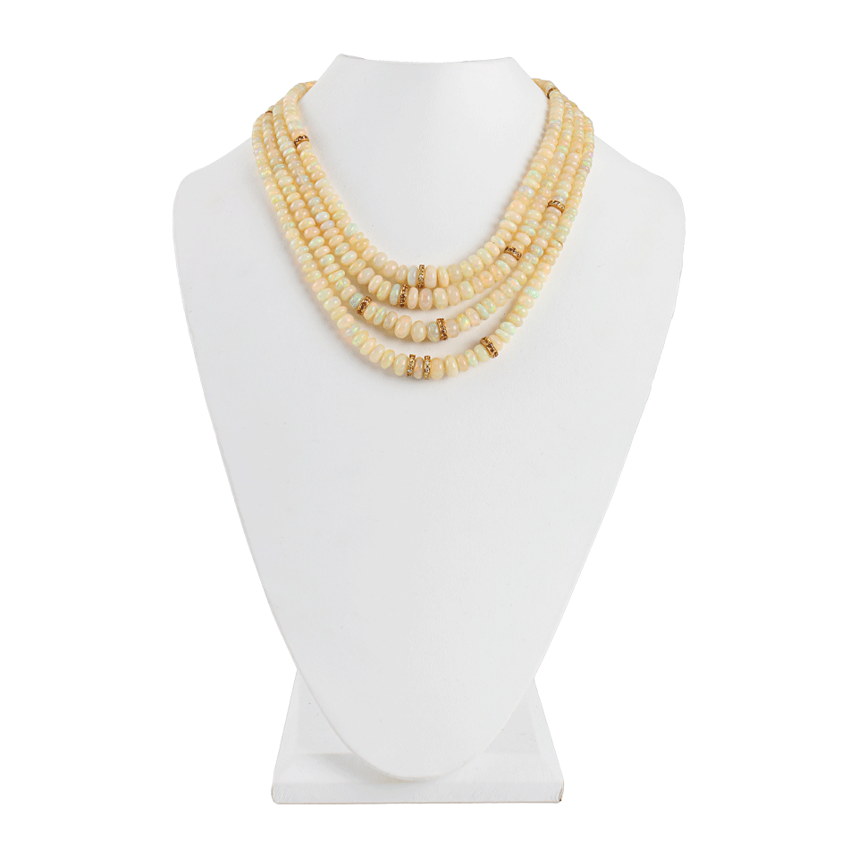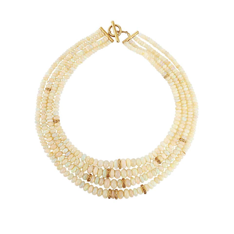 With four strands opals and diamonds blended together to create such an elaborate accessory, you will have no problem using Yossi Harari’s four-strand Roxanne opal necklace to make a statement. It’s bold size and attractive disc shape allow it to add texture and interest to your look.