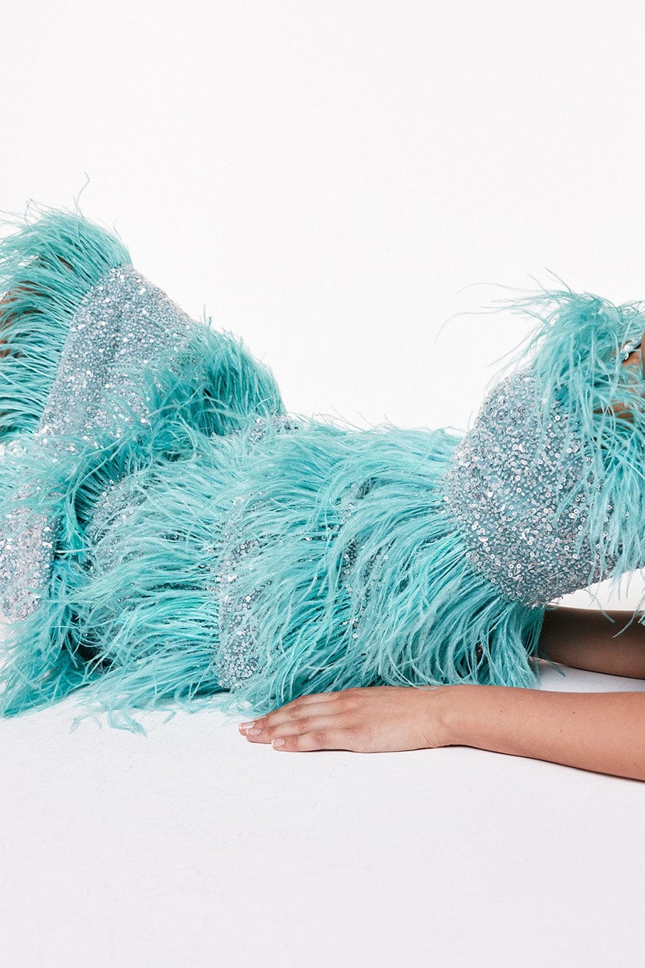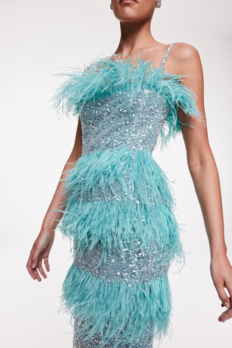 Rachel Gilbert frenchy midi dress in aqua with feather layers.