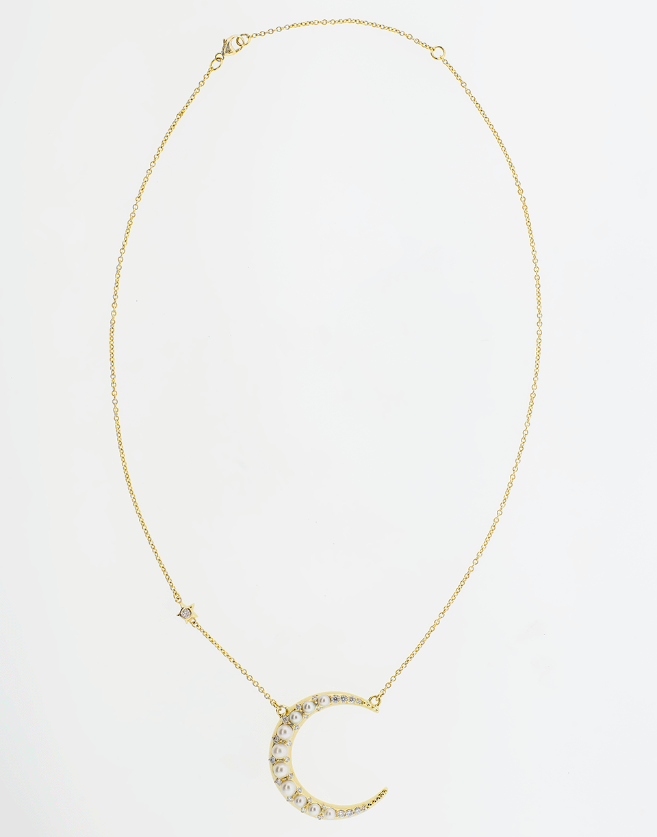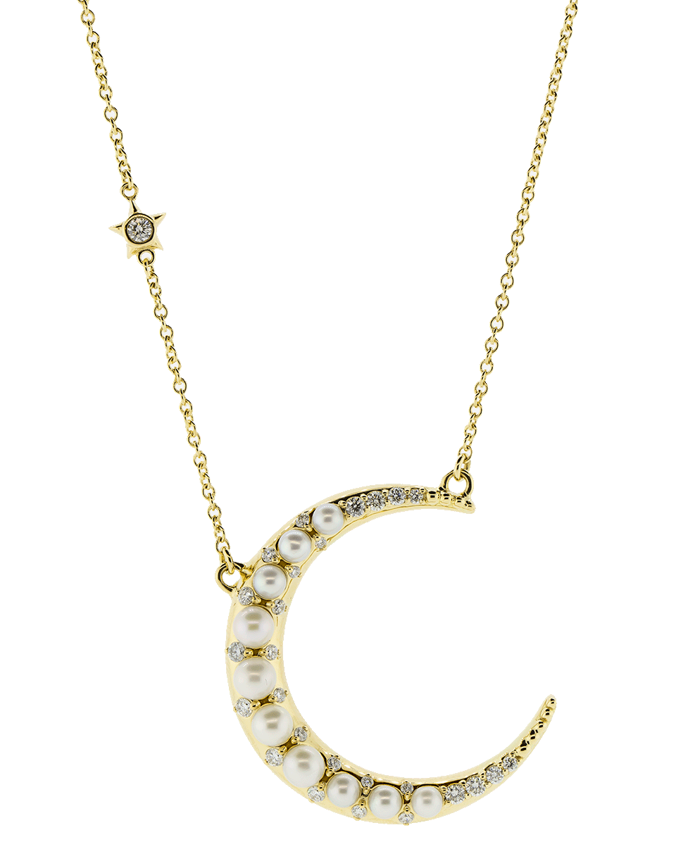 From the Sun, Moon and Stars collection, this crescent moon charm necklace from Monica Rich Kosann radiates like the moon in a starry night. Attached to an adjustable length cable chain with a bezel star set diamond accents, the oversized crescent charm features large freshwater pearls and set white diamonds.
