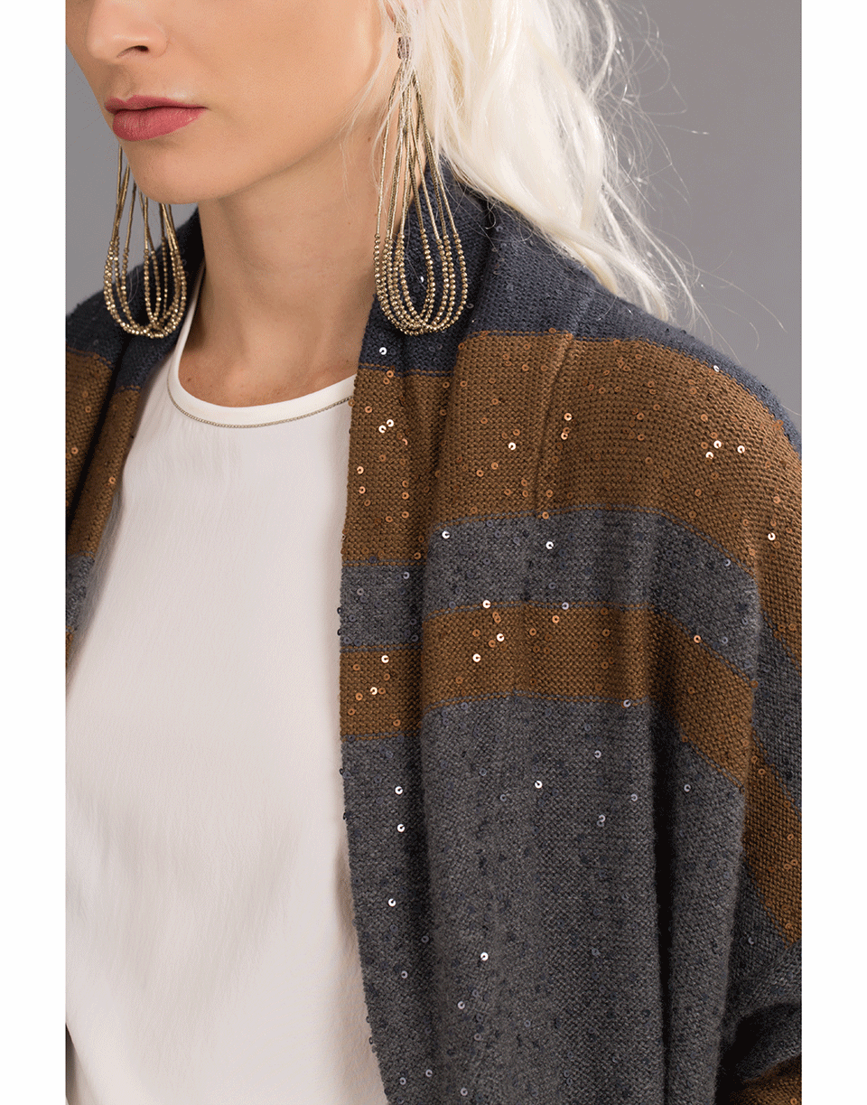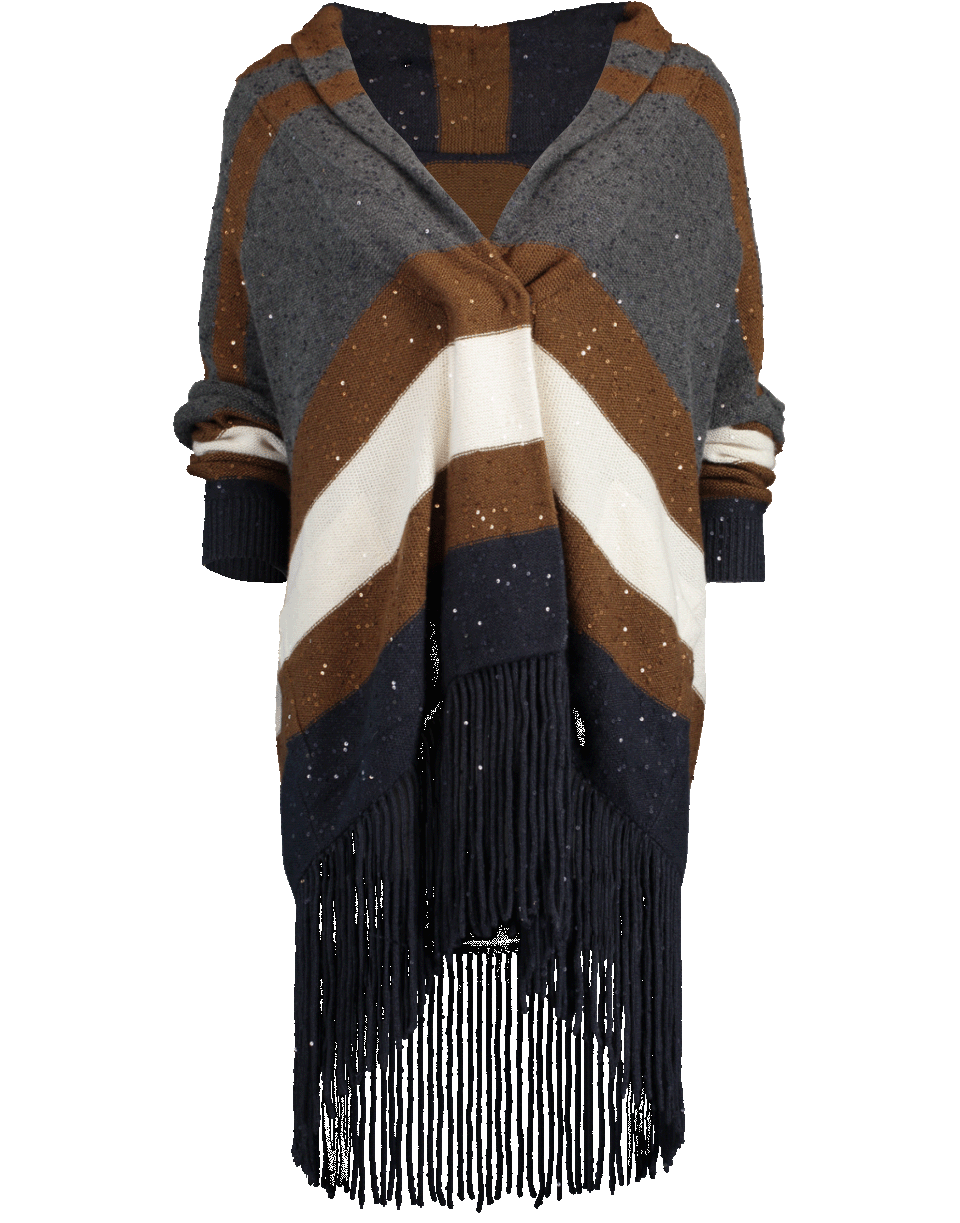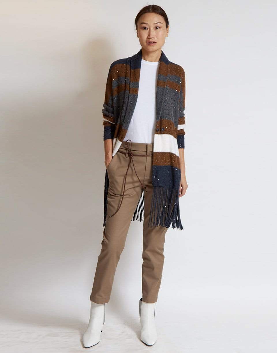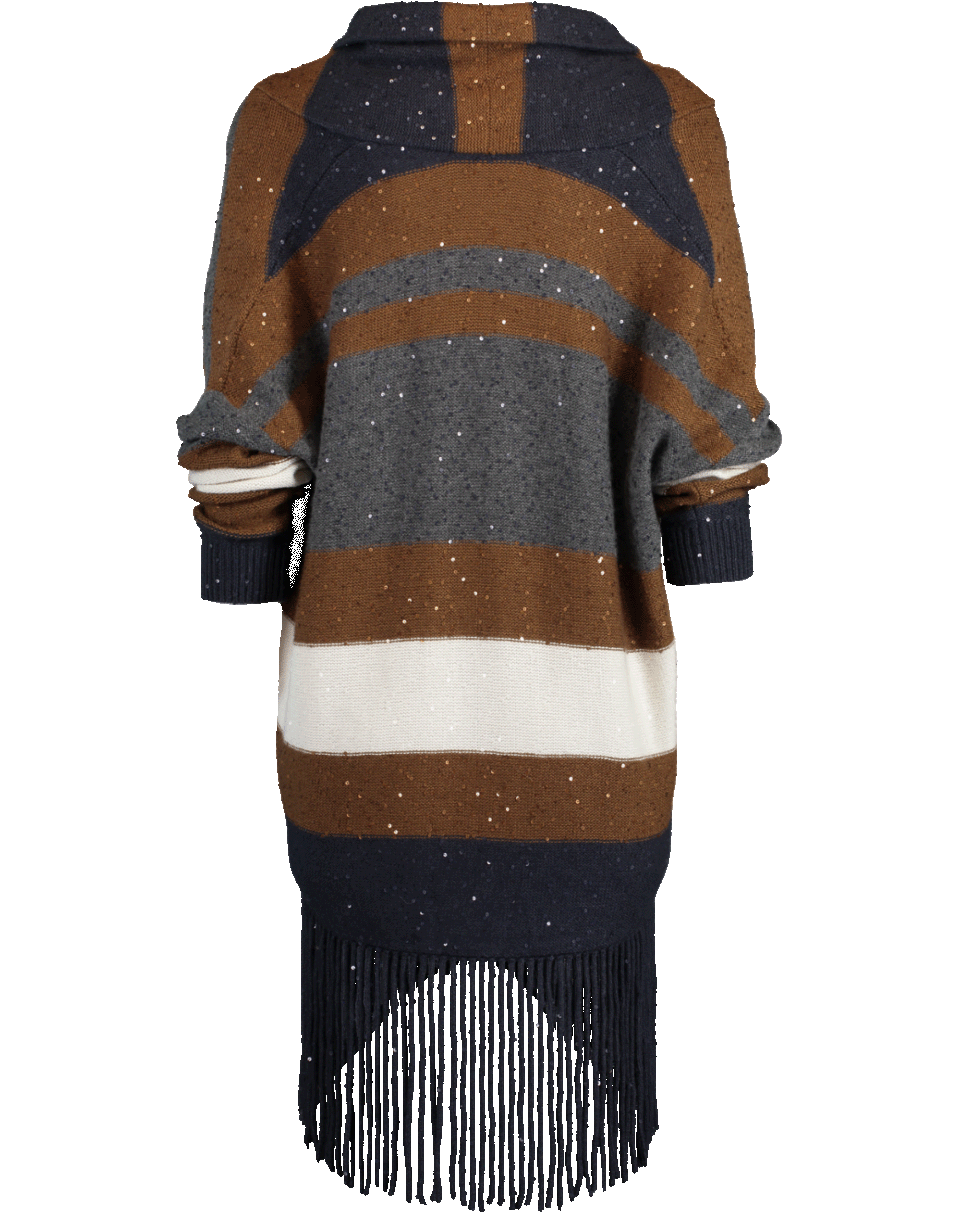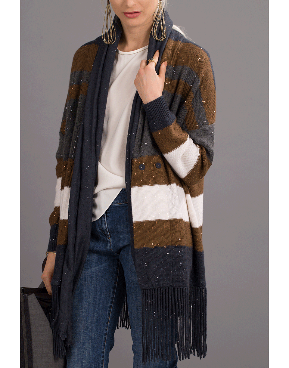 Linen silk paillette striped cardigan from Brunello Cucinelli featuring long sleeves, shawl collar, snap button closure, fringe hem, and finished with paillette embroidery.