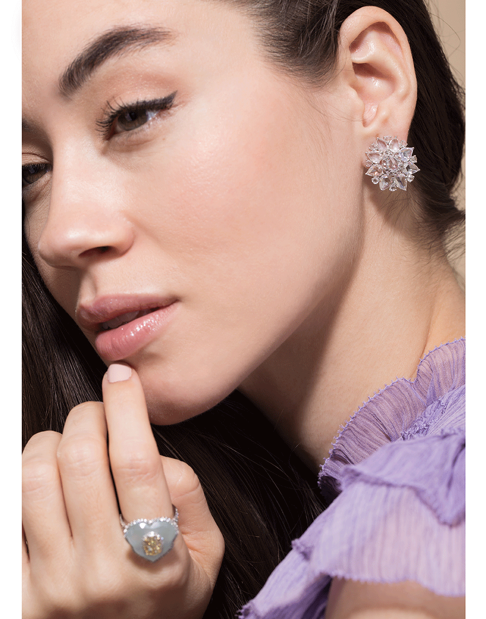 Saboo flower earrings with rose cut and full cut diamonds set in 18k white gold. For pierced ears.