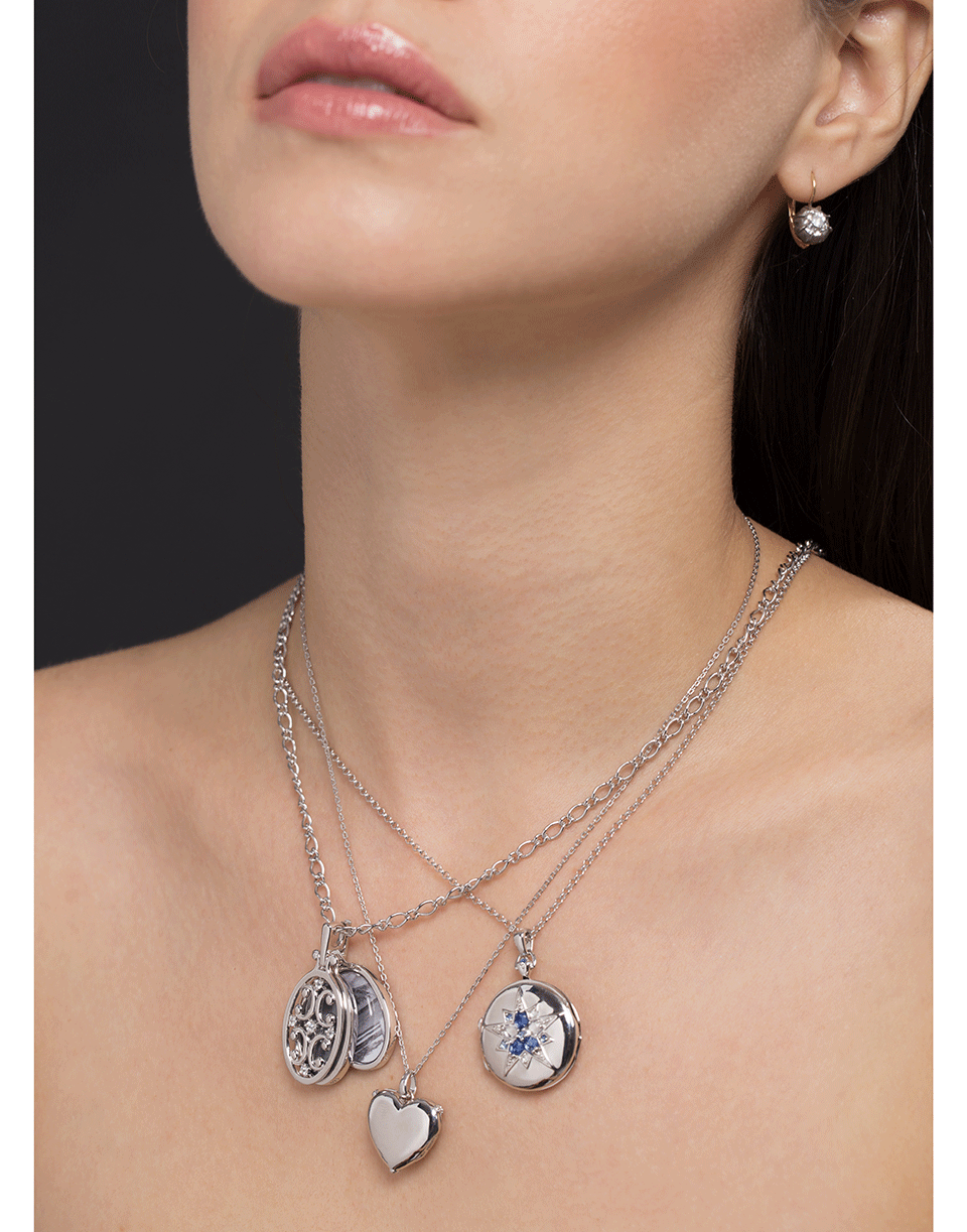 This 3-piece sterling silver locket set from Monica Rich Kosann features an iron gate style with a floral pattern peeking out from the back. Designed to fit 2/3 photos.