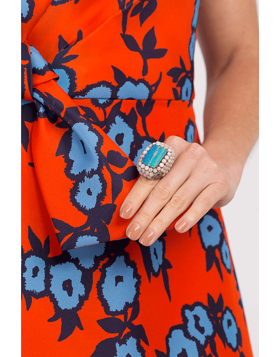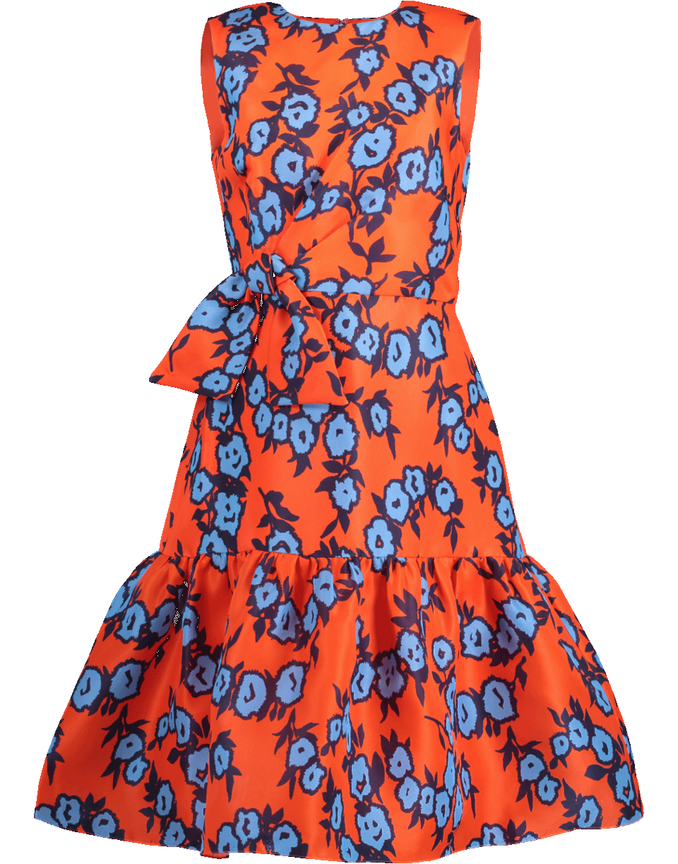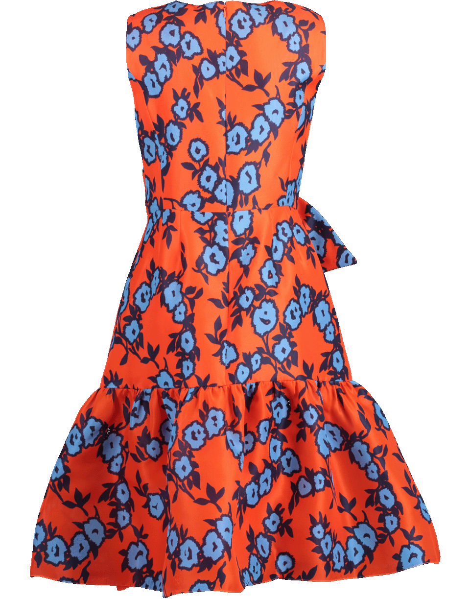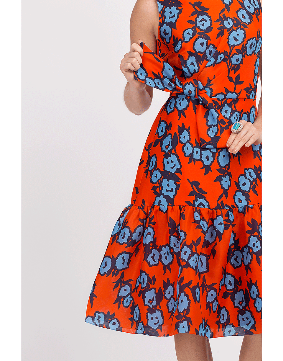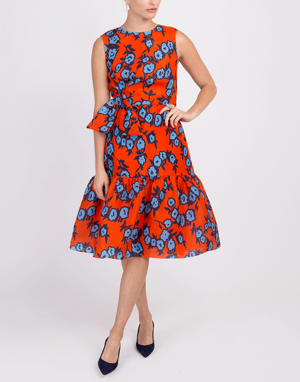 Bold floral print silk knee length dress from Carolina Herrera featuring a sleeveless cut, round neckline, concealed back zip closure, ruffle hem, and finished with a gathered bow at the waist.