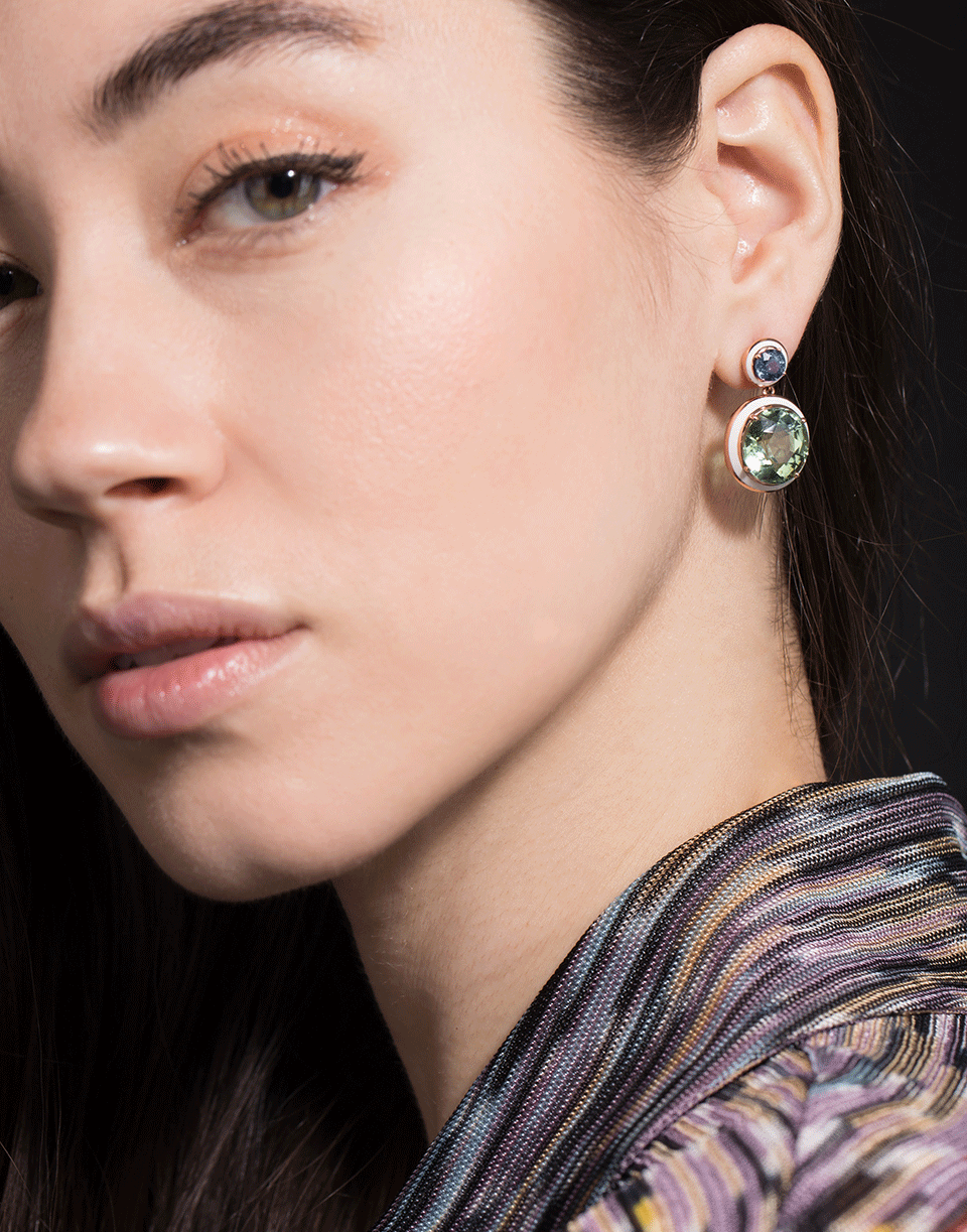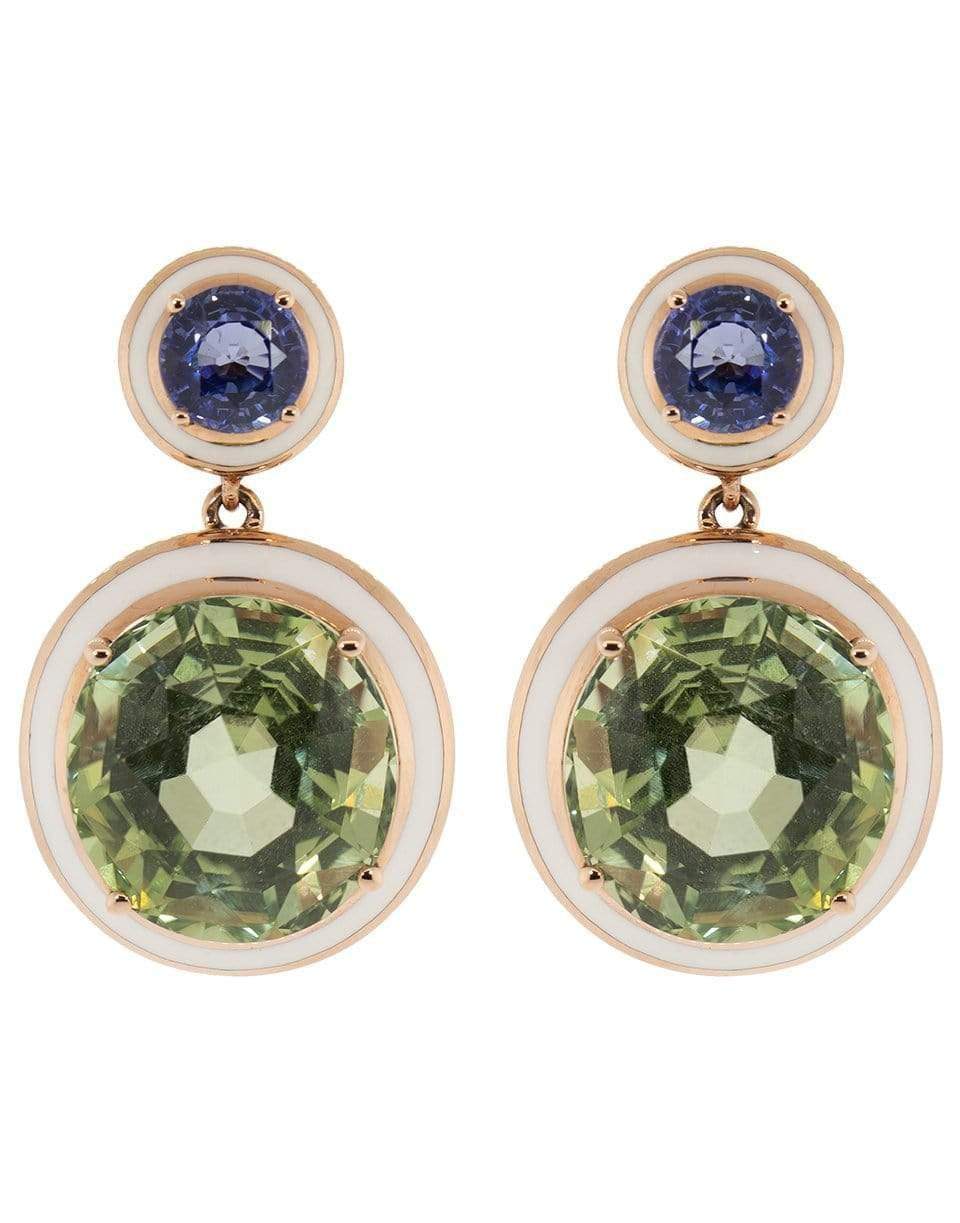 Selim Mouzannar Gemma green tourmaline and blue sapphire earrings set with white enamel. For pierced ears