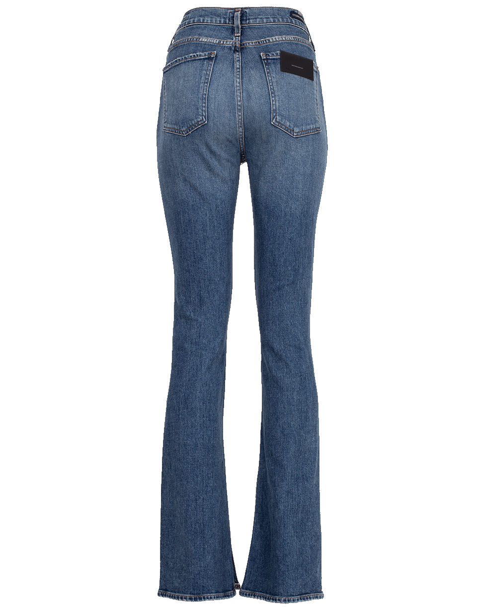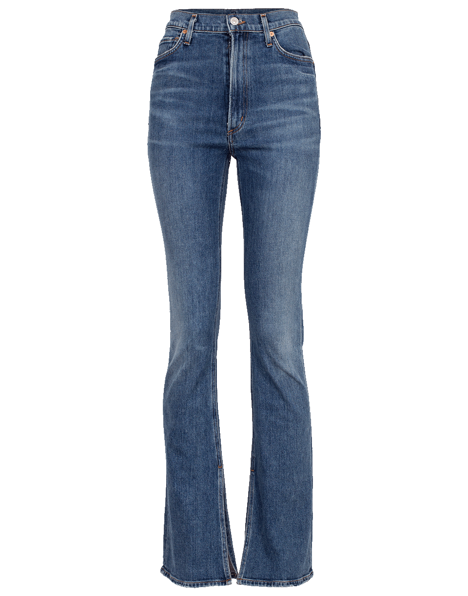 Bootcut Citizens of Humanity 'Georgia' jeans with a high-rise waist, zip fly, five pocket style, and inner leg split.
