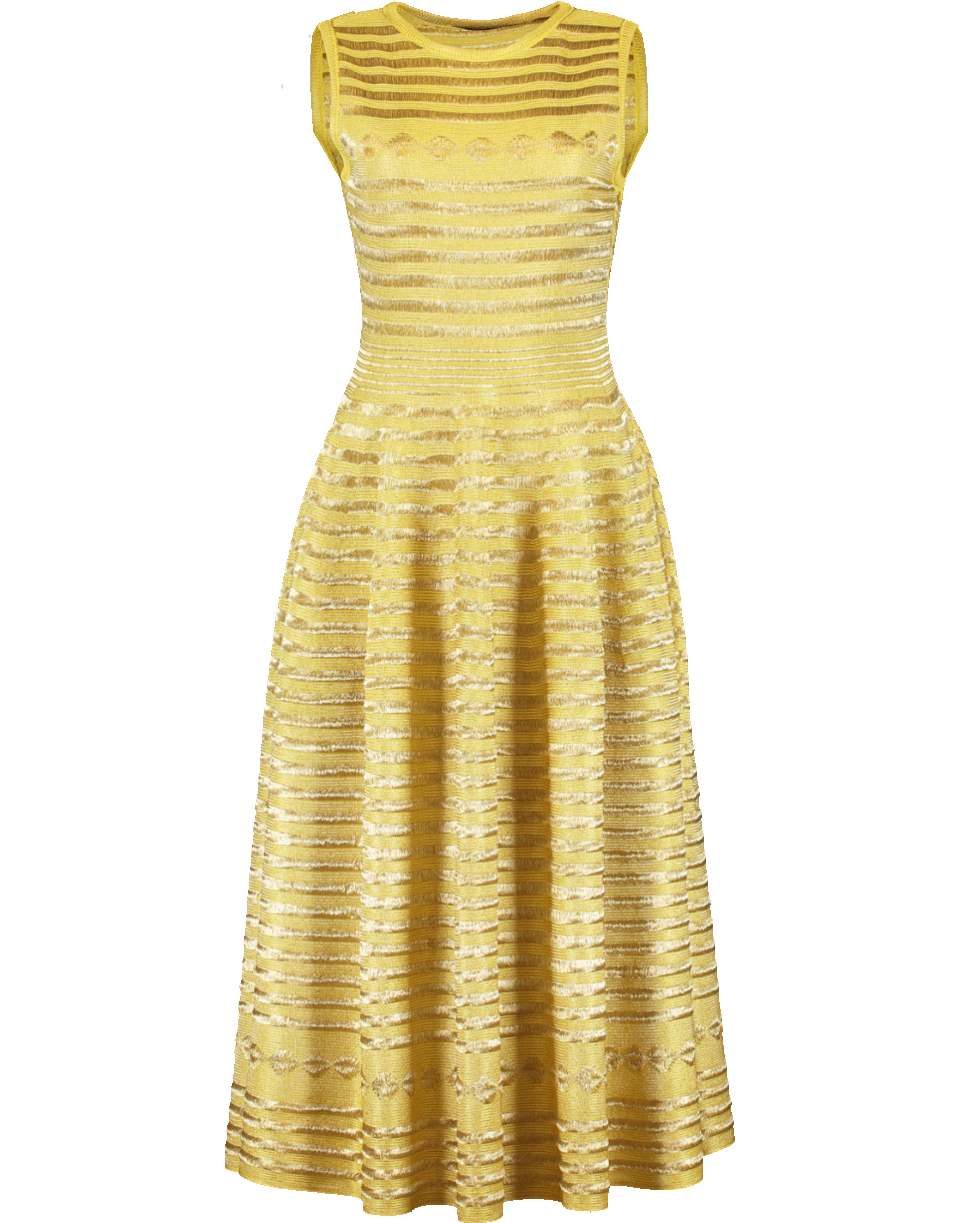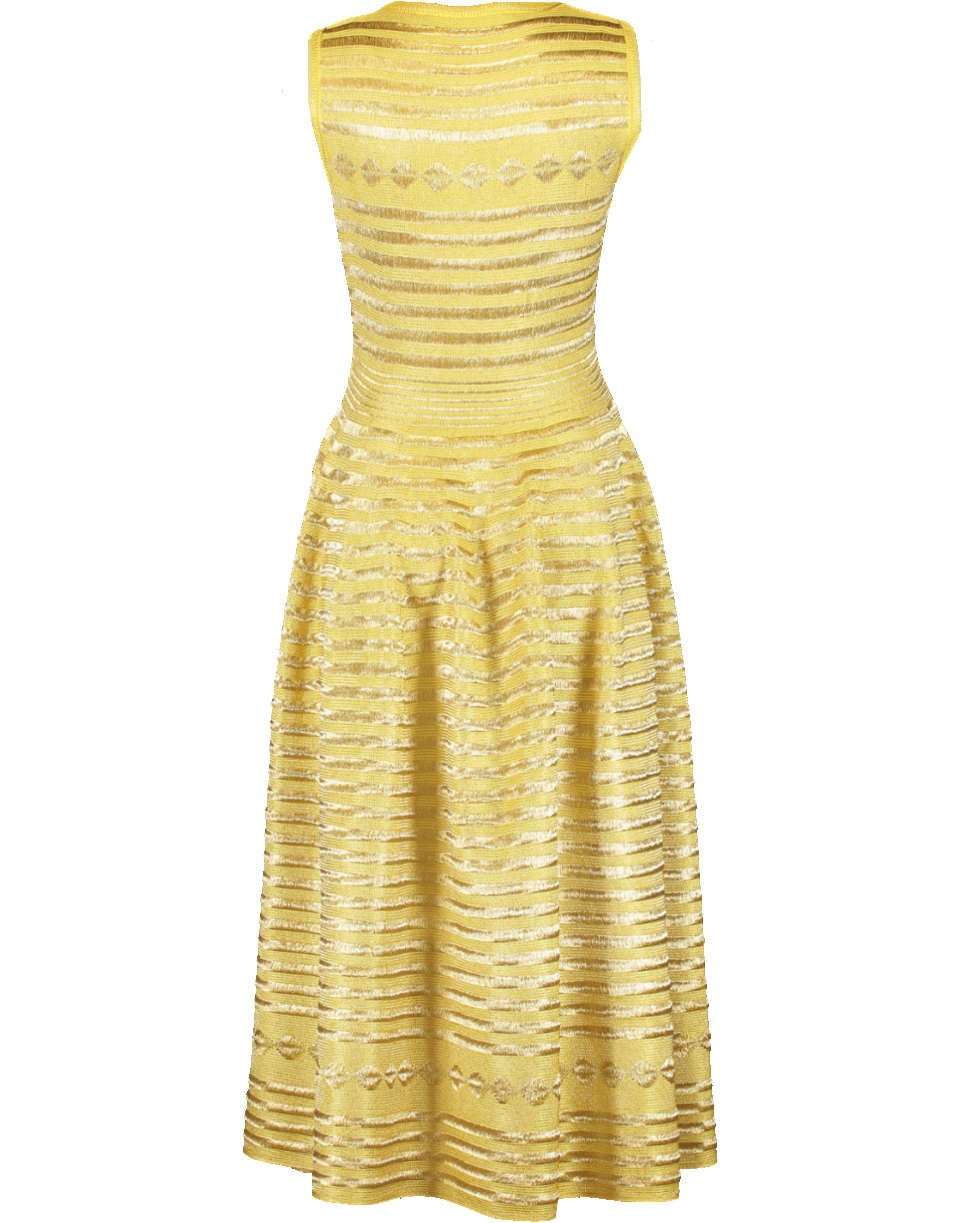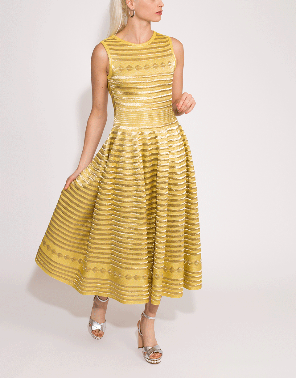 Gold metallic long dress by Antonino Valenti. This sleeveless maxi length dress features metallic embellishment throughout, a round neckline, fitted waist and a flared bottom.
