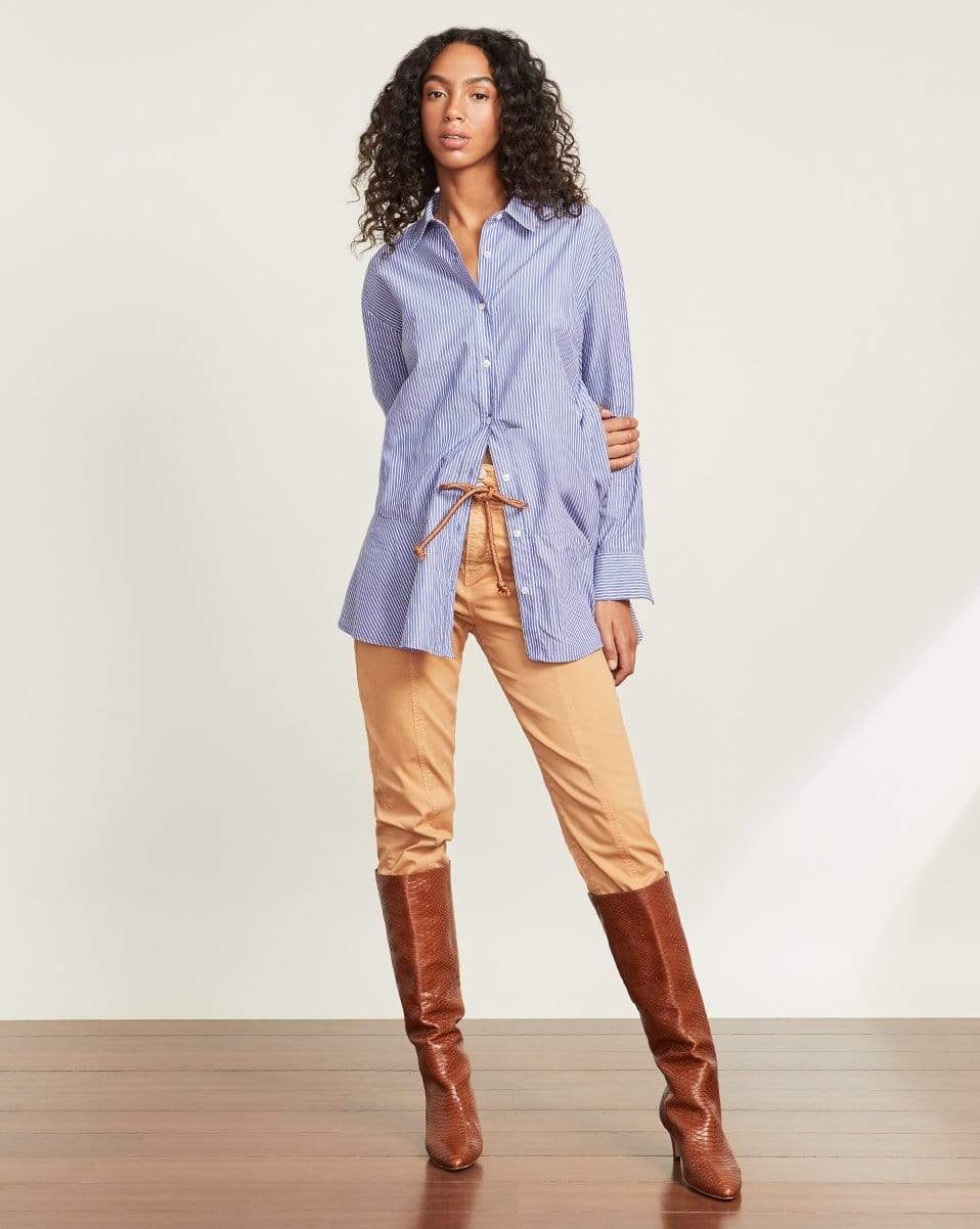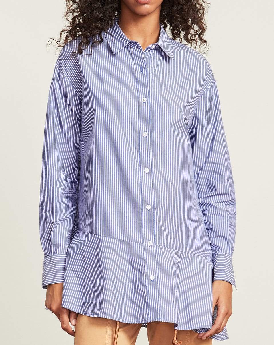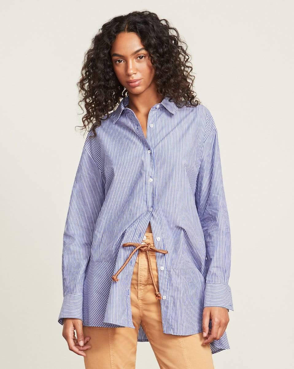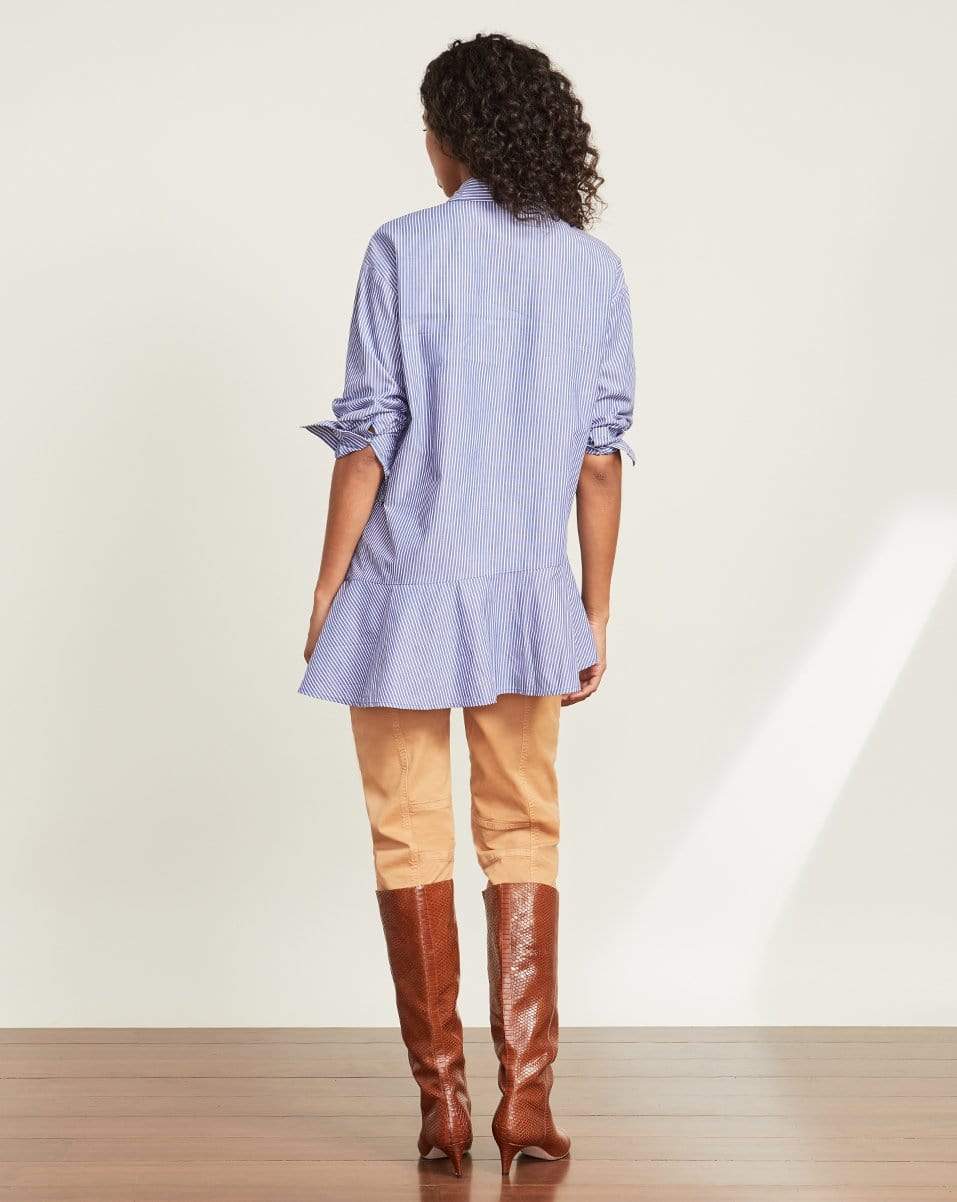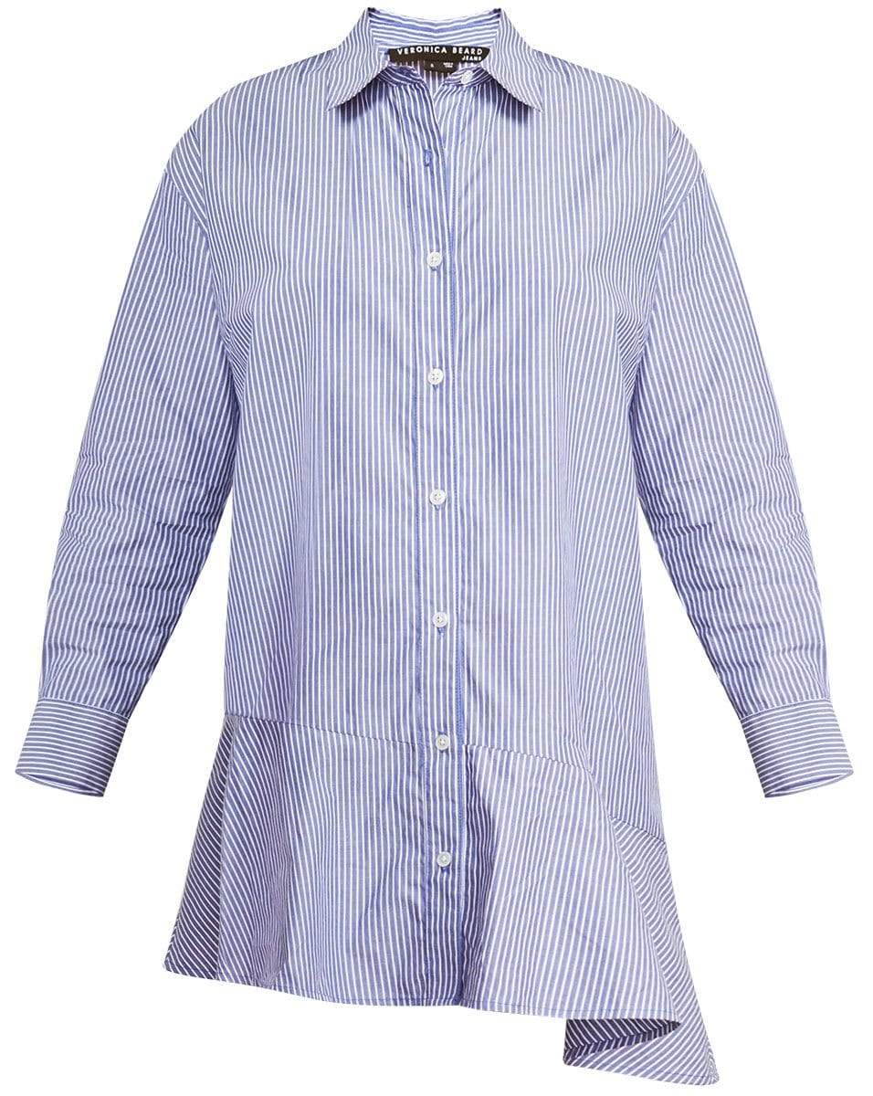 Veronica Beard gilda shirt in blue white. Everyone needs an oversized button-down top, and the Gilda is it. A flounced hem gives this striped poplin style a feminine finish. The versatility is endless here—wear it over skinny jeans and clogs, or leave it unbuttoned as a cover-up at the beach. Either way, this is a must-have.