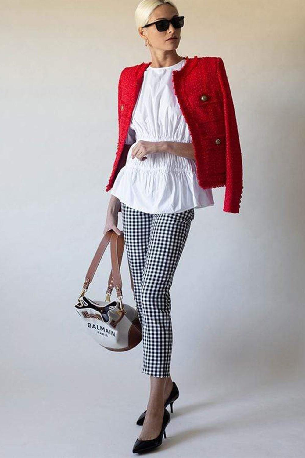 Michael Kors gingham cotton side zip pant with a high waist and slim leg.