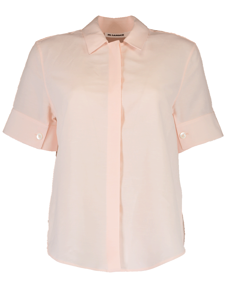 Jil Sander Giuditta classic button down blouse. This top features a spread collar with fastenings at the cuffs. It's curved hem with hidden front button closures create a classic look for this blouse.